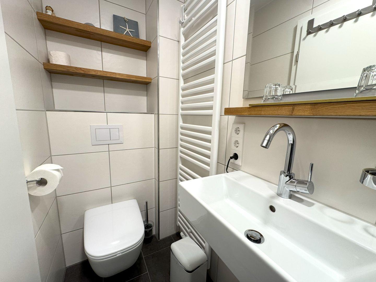Der Schlafbereich, bestehend aus zwei Einzelbetten, bietet einen ruhigen Rückzugsort für erholsame Nächte. Das Badezimmer ist mit einer bodengleichen Dusche, einem Waschbecken und einem WC ausgestattet und es stehen Ihnen frische Handtücher sowie Badetücher zur Verfügung. Selbstverständlich ist das gesamte Appartement rauchfrei.