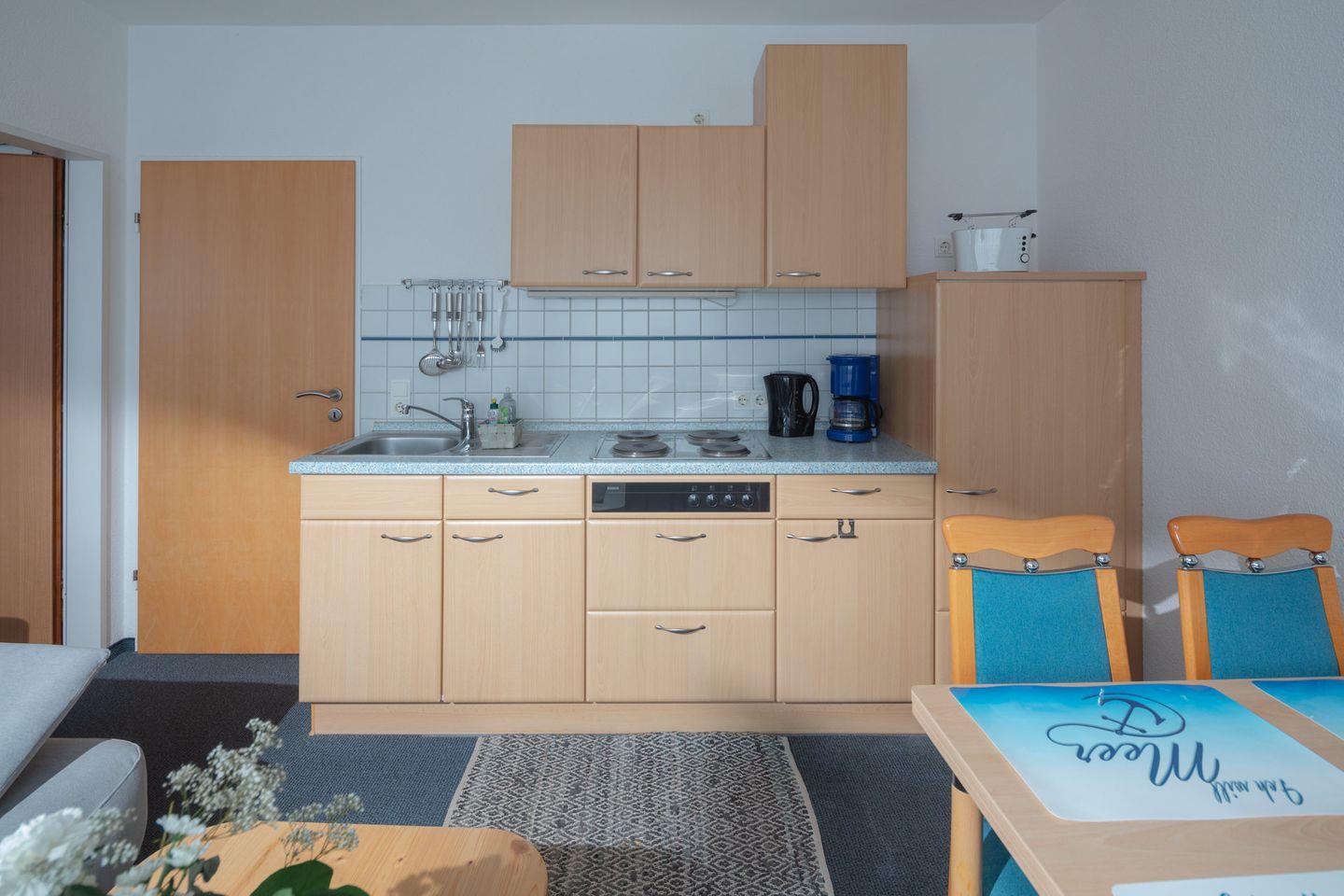 Die Wohnung verfügt über einen offenen Wohn- und Essbereich, der durch Fenster lichtdurchflutet ist. Hier können Sie nach einem erlebnisreichen Tag am Strand entspannen – sei es auf dem Sofa oder bei einem gemeinsamen Essen am Esstisch. Die praktische Küche ist voll ausgestattet mit allem, was Sie für die Zubereitung Ihrer Lieblingsgerichte benötigen, darunter ein 4-Platten-Herd, ein Kühlschrank, eine Kaffeemaschine sowie Geschirr und Besteck. Auch deren praktischen Küchenutensilien lassen keine Wünsche offen und machen das Kochen zum Vergnügen.