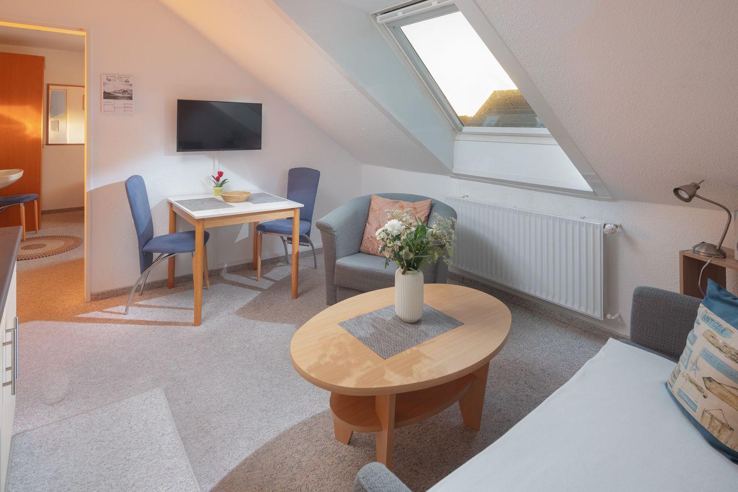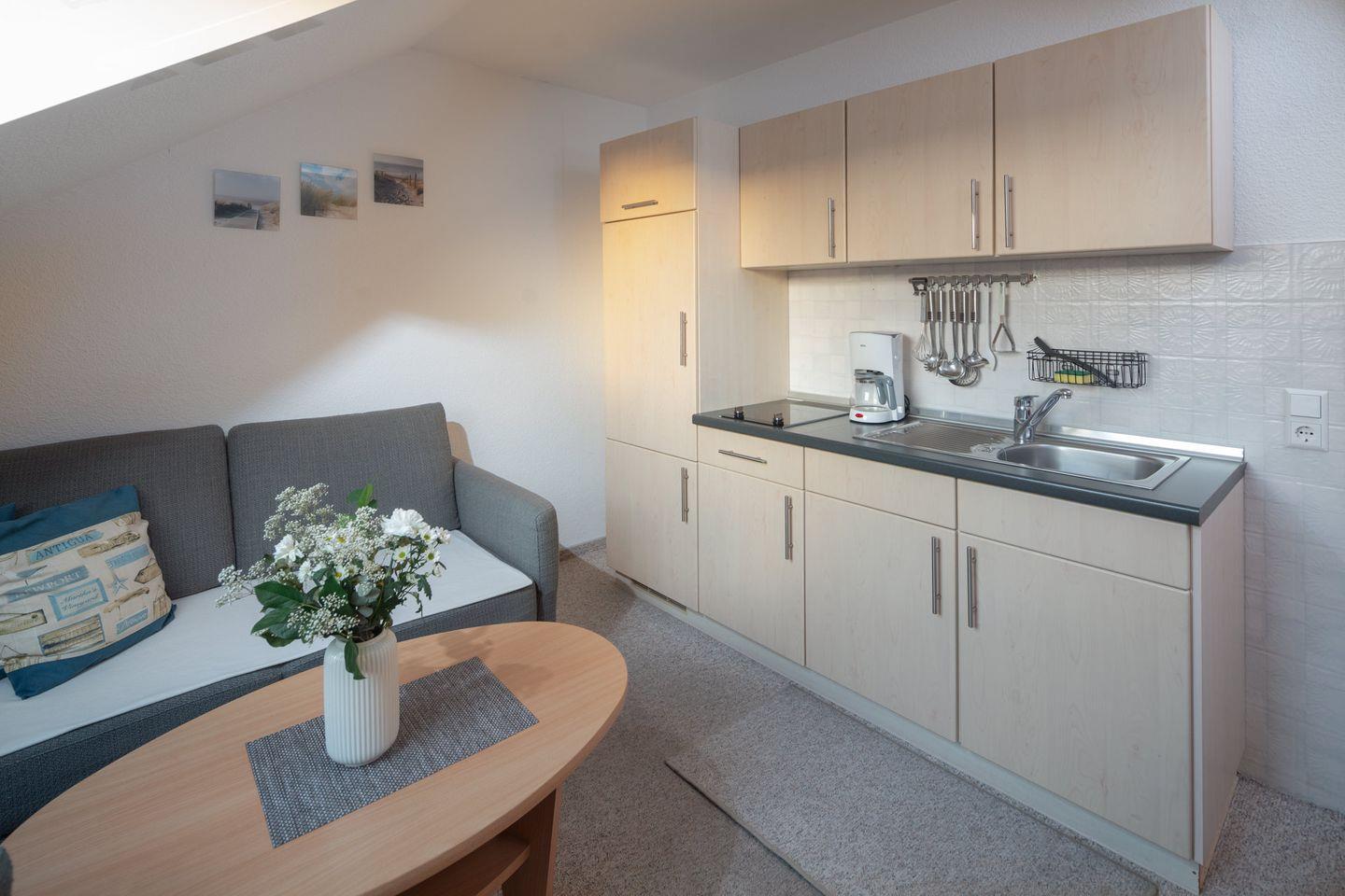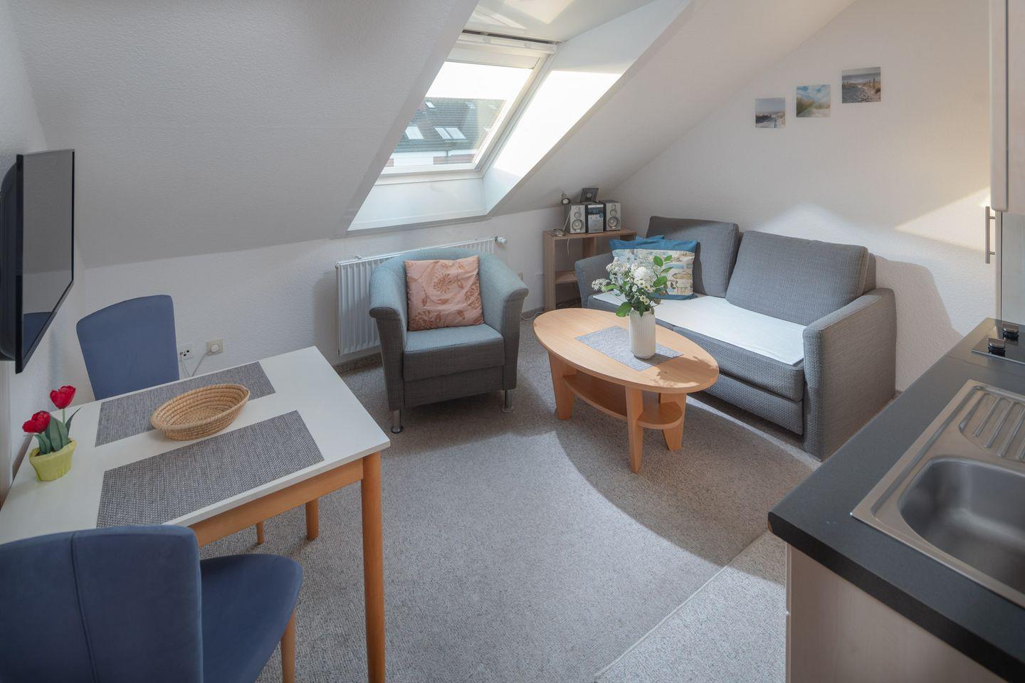 Die Wohnung verteilt sich auf eine Fläche von 30 m² im zweiten Stock eines gepflegten Hauses. Der Wohnbereich ist mit einem bequemen Sofa, einem Sessel und einem Fernseher ausgestattet, sodass Sie nach einem erlebnisreichen Tag auf der Insel entspannen können. Die offenen Wohnküche ist modern eingerichtet und bietet alles, was Sie für einen angenehmen Aufenthalt benötigen: einen Kühlschrank, einen Ceranherd, eine Kaffeemaschine und verschiedene Küchenutensilien. Gemeinsam am Esstisch genießen Sie Ihre selbst zubereiteten Gerichte in einem gemütlichen Ambiente.