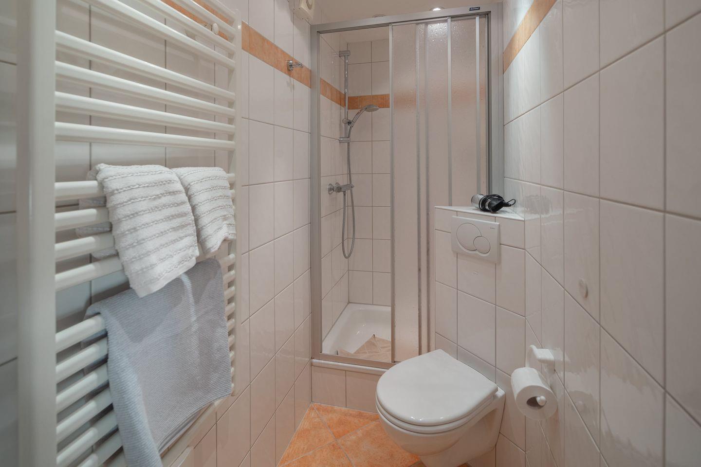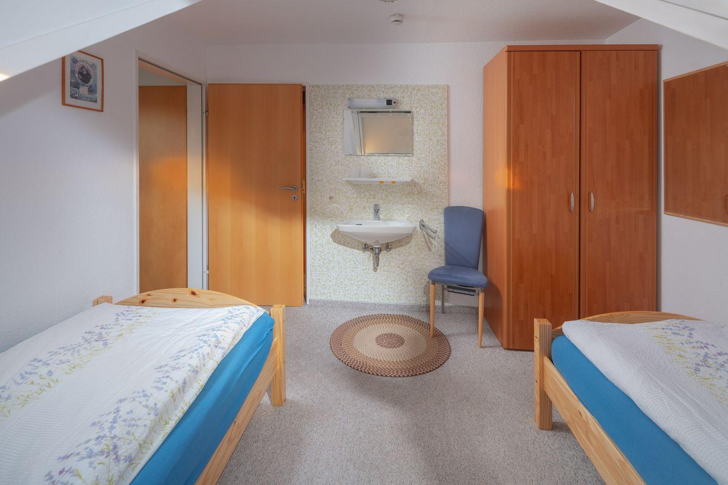 Das Schlafzimmer ist mit zwei Einzelbetten ausgestattet, freundlich gestaltet und sorgt für erholsame Nächte. Für die kleinsten Gäste steht zusätzlich ein Babybett sowie ein Hochstuhl auf Nachfrage bereit, sodass Familien mit Kleinkindern herzlich willkommen sind. Das Badezimmer bietet Ihnen mit einer Dusche die Möglichkeit, sich nach einem langen Strandtag entspannt zu erfrischen.