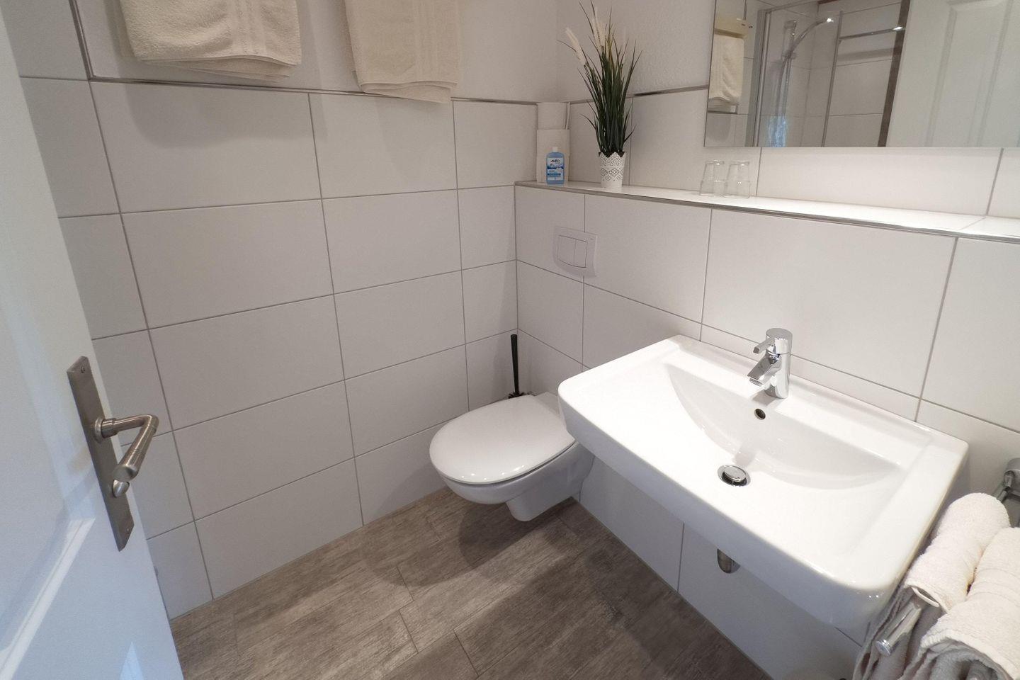 Das moderne Badezimmer ist funktional gestaltet und verfügt über eine Dusche, ein Waschbecken und ein WC. Zusätzlicher Komfort wird durch einen Kosmetikspiegel und eine Erstausstattung mit Handtüchern und Bettwäsche geboten.