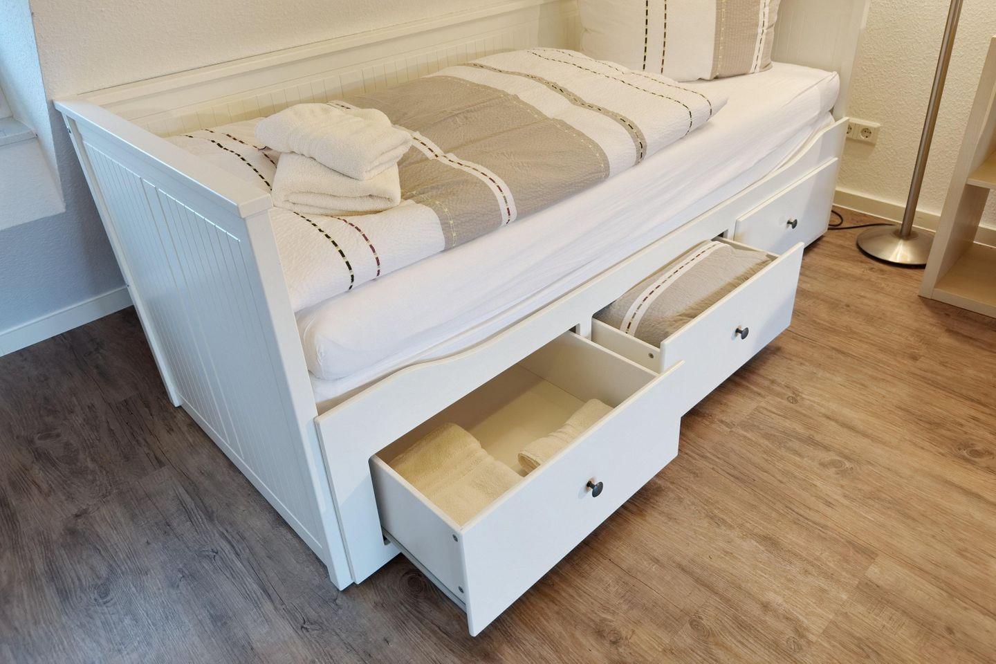 Das gemütliche Schlafzimmer mit stilvollem Parkettboden sorgt für eine angenehme Atmosphäre. Im hellen Wohnzimmer lädt ein komfortables Sofa zum Entspannen ein – es lässt sich bei Bedarf in eine zusätzliche Schlafgelegenheit verwandeln. Der angrenzende Essbereich bietet Platz für gemeinsame Mahlzeiten, und in der gut ausgestatteten Kochnische findest du alles, was du brauchst: Kühlschrank, Herd, Backofen, Mikrowelle sowie praktische Küchenutensilien und Geschirr.