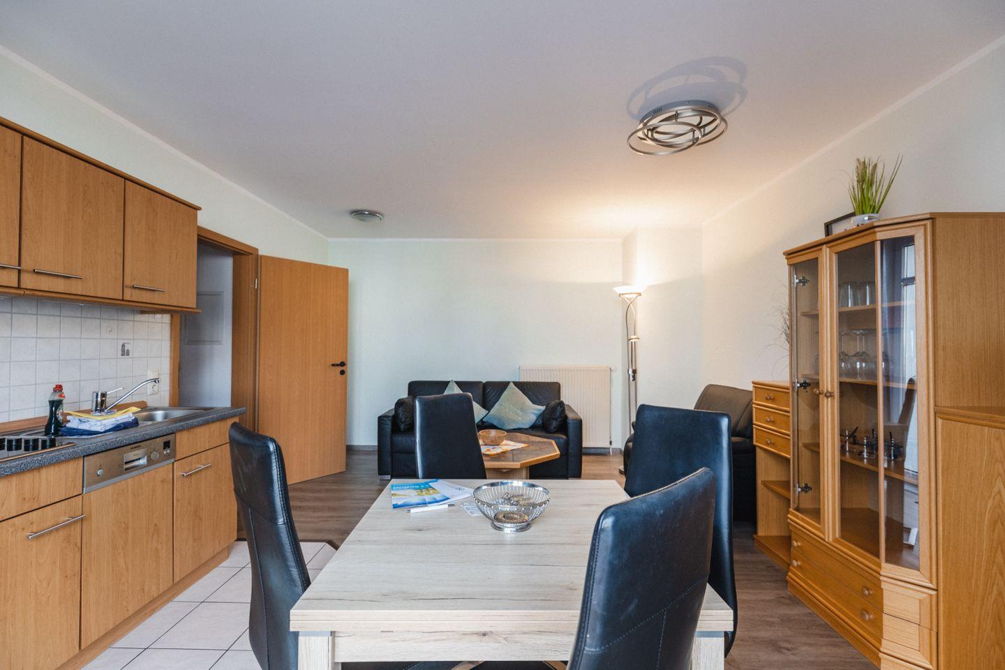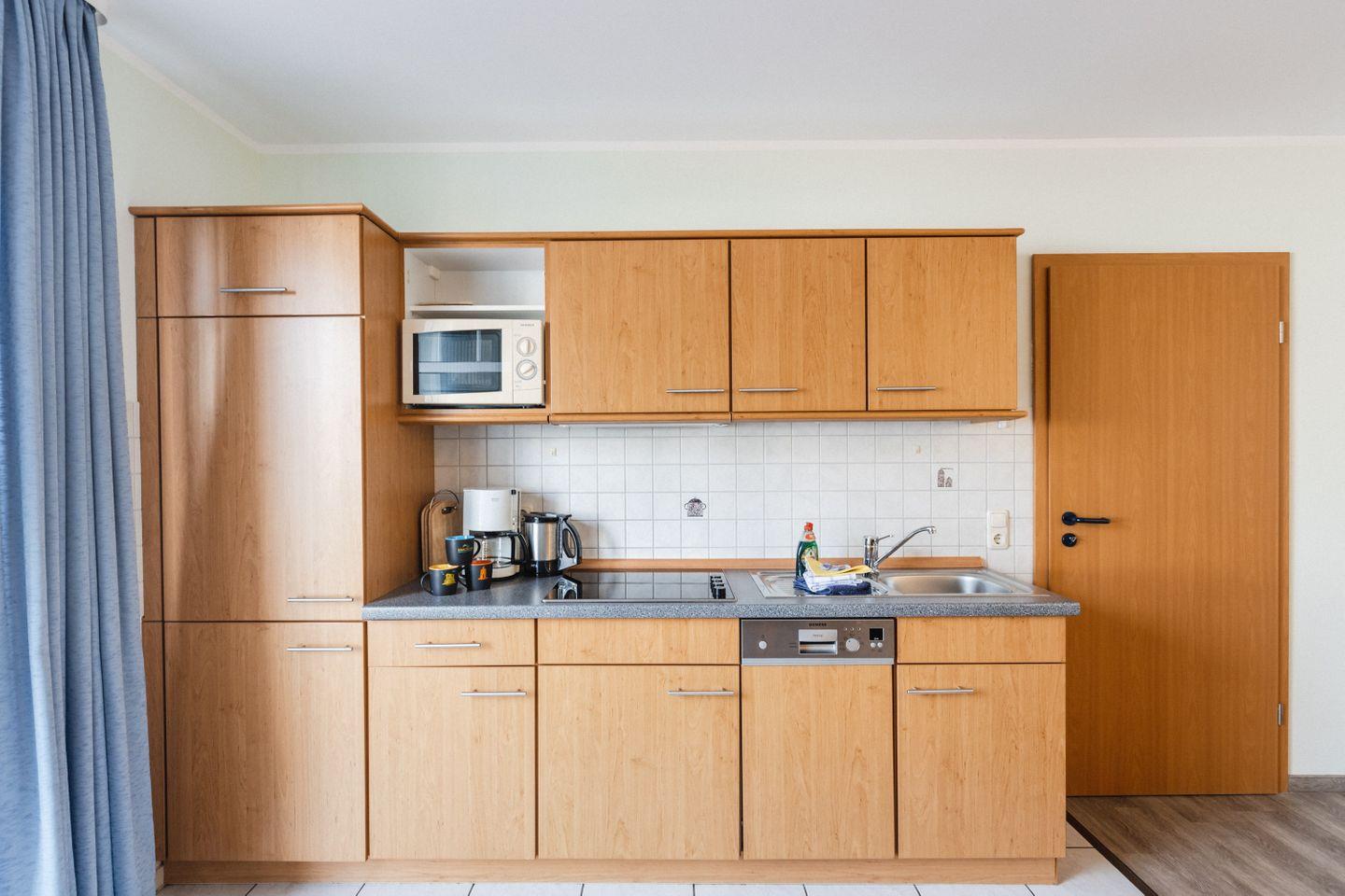 Die voll ausgestattete Kochnische verfügt über Herd, Mikrowelle, Spülmaschine und alle wichtigen Küchenutensilien – ideal für gemeinsame Mahlzeiten am Esstisch. WLAN ist natürlich inklusive, damit du jederzeit verbunden bleibst.