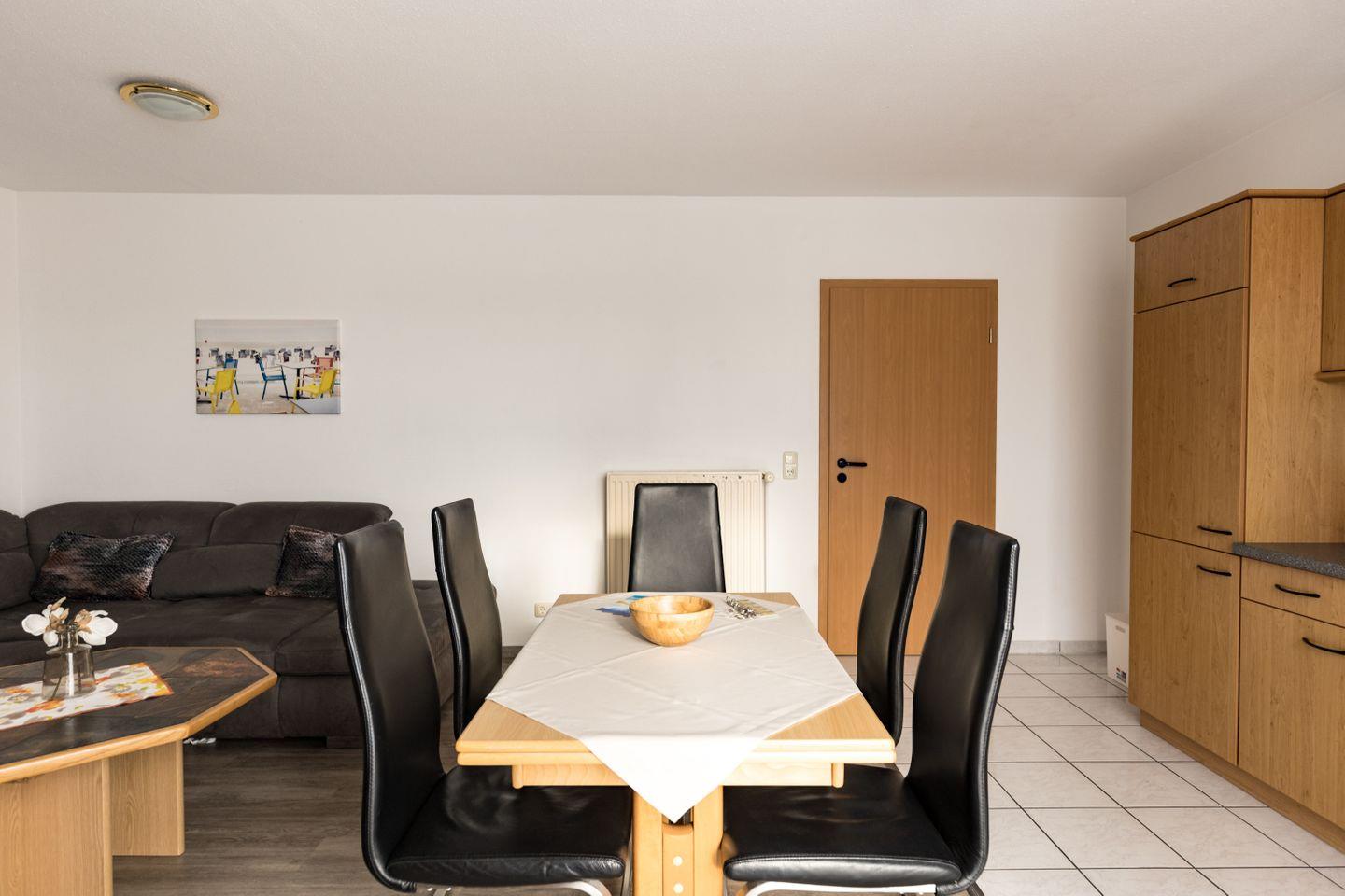Das helle, gemütliche Wohnzimmer lädt mit einer bequemen Sofaecke und einem Esstisch zum Verweilen ein. Zwei komfortable Schlafzimmer sorgen für erholsame Nächte. In der voll ausgestatteten Kochnische findest du Herd, Spülmaschine, Mikrowelle und Kaffeemaschine – perfekt für gemeinsame Mahlzeiten.