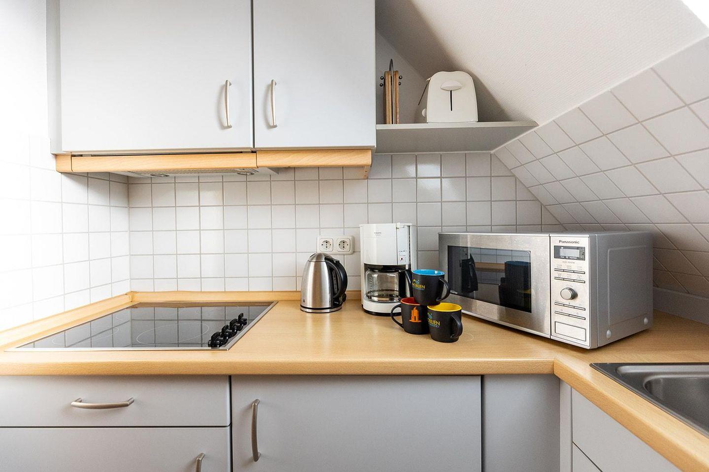 Die geschlossene, voll ausgestattete Küche ist ein weiteres Highlight: Cerankochfeld, Spülmaschine, Mikrowelle, Kühlschrank mit Gefrierfach und Kaffeemaschine stehen bereit – perfekt für Selbstversorger. Starte den Tag mit einem Kaffee oder genieße dein Lieblingsgericht mit Blick in den Garten.