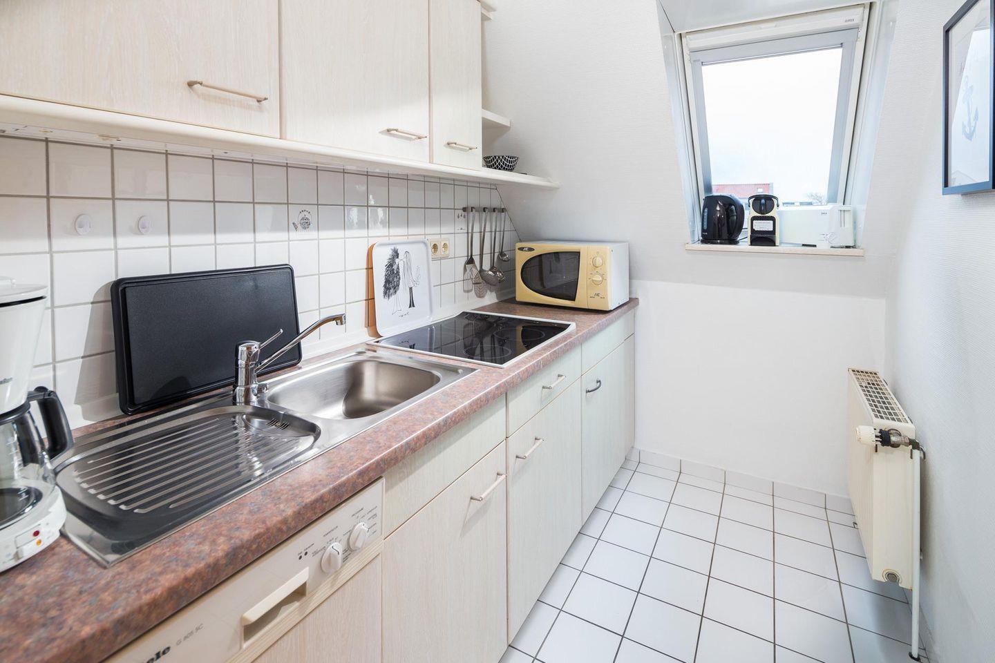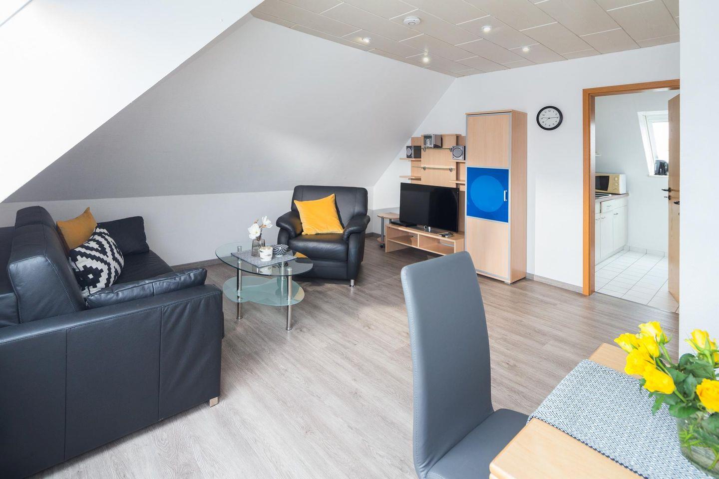 Das großzügige Schlafzimmer sorgt mit hochwertiger Bettwäsche für erholsamen Schlaf nach einem Tag am Meer. Der freundliche Wohn- und Essbereich lädt mit einer bequemen Sofaecke zum Entspannen ein – ob bei einem guten Film auf dem TV oder bei einem gemütlichen Gespräch. Der Essbereich bietet Platz für gemeinsame Mahlzeiten, die du in der voll ausgestatteten Küche zubereiten kannst. Mit Cerankochfeld, Mikrowelle, Spülmaschine, Kaffeemaschine und Wasserkocher sind dir keine Grenzen gesetzt!
