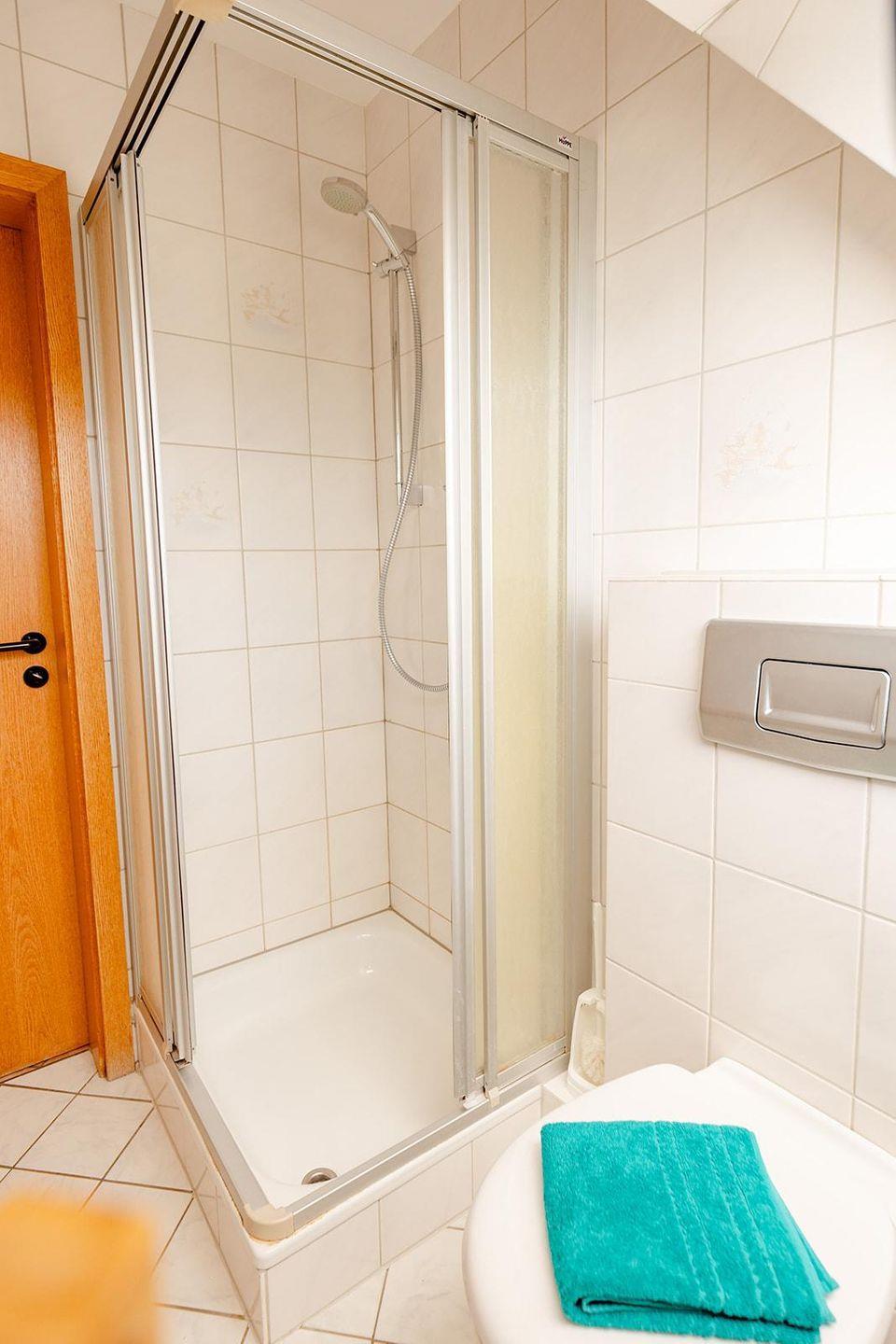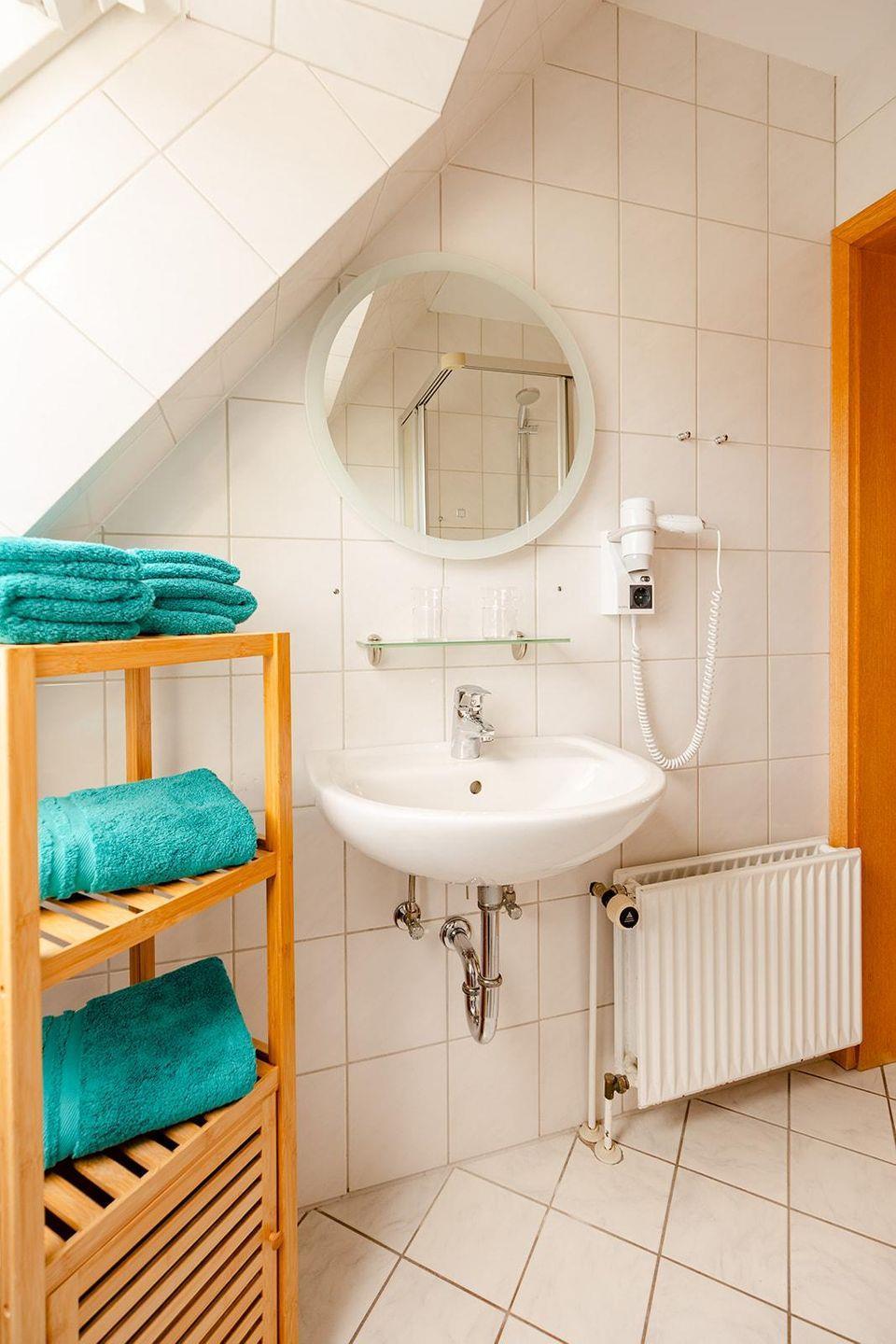 Das moderne Badezimmer verfügt über eine Dusche, WC und einen Kosmetikspiegel. Eine gemeinschaftliche Waschmaschine und ein Trockner stehen für längere Aufenthalte bereit. Die Wohnung ist eine Nichtraucherunterkunft und mit Rauchmeldern ausgestattet.