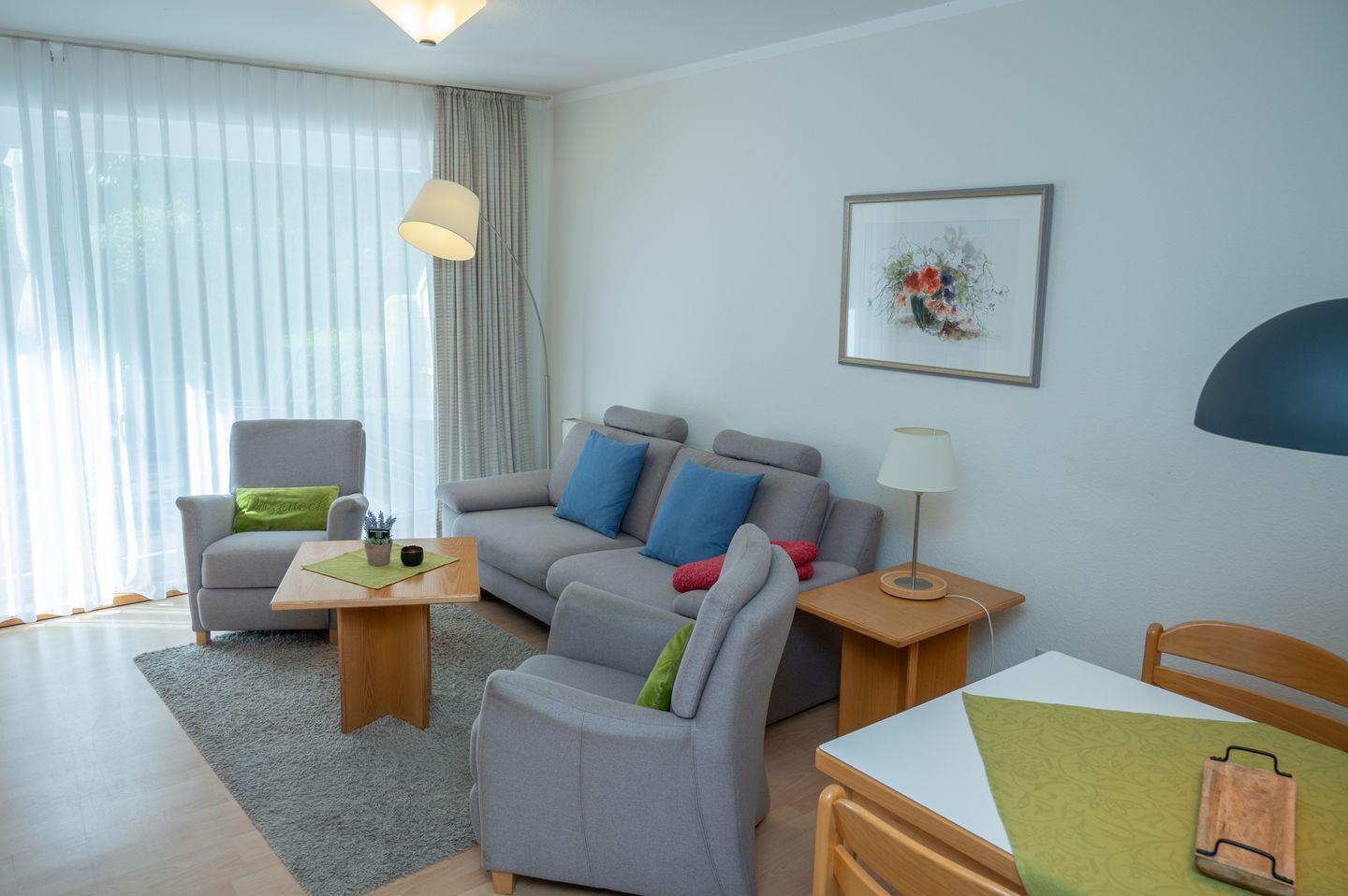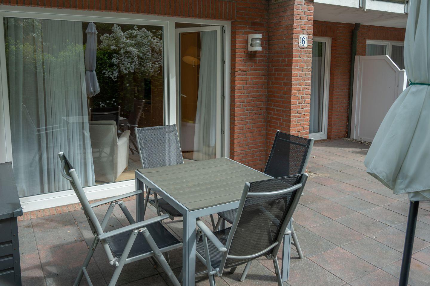 Ein weiteres Highlight der Unterkunft ist die große, private Süd-Terrasse, die zum Verweilen im Freien einlädt. Genießen Sie Ihre morgendlichen Kaffee, während Sie die frische Meeresbrise einatmen oder entspannen Sie bei einem guten Buch unter dem Sonnenschirm. Der Blick ins Grüne sorgt für eine ruhige Atmosphäre und lädt zu erholsamen Momenten ein.