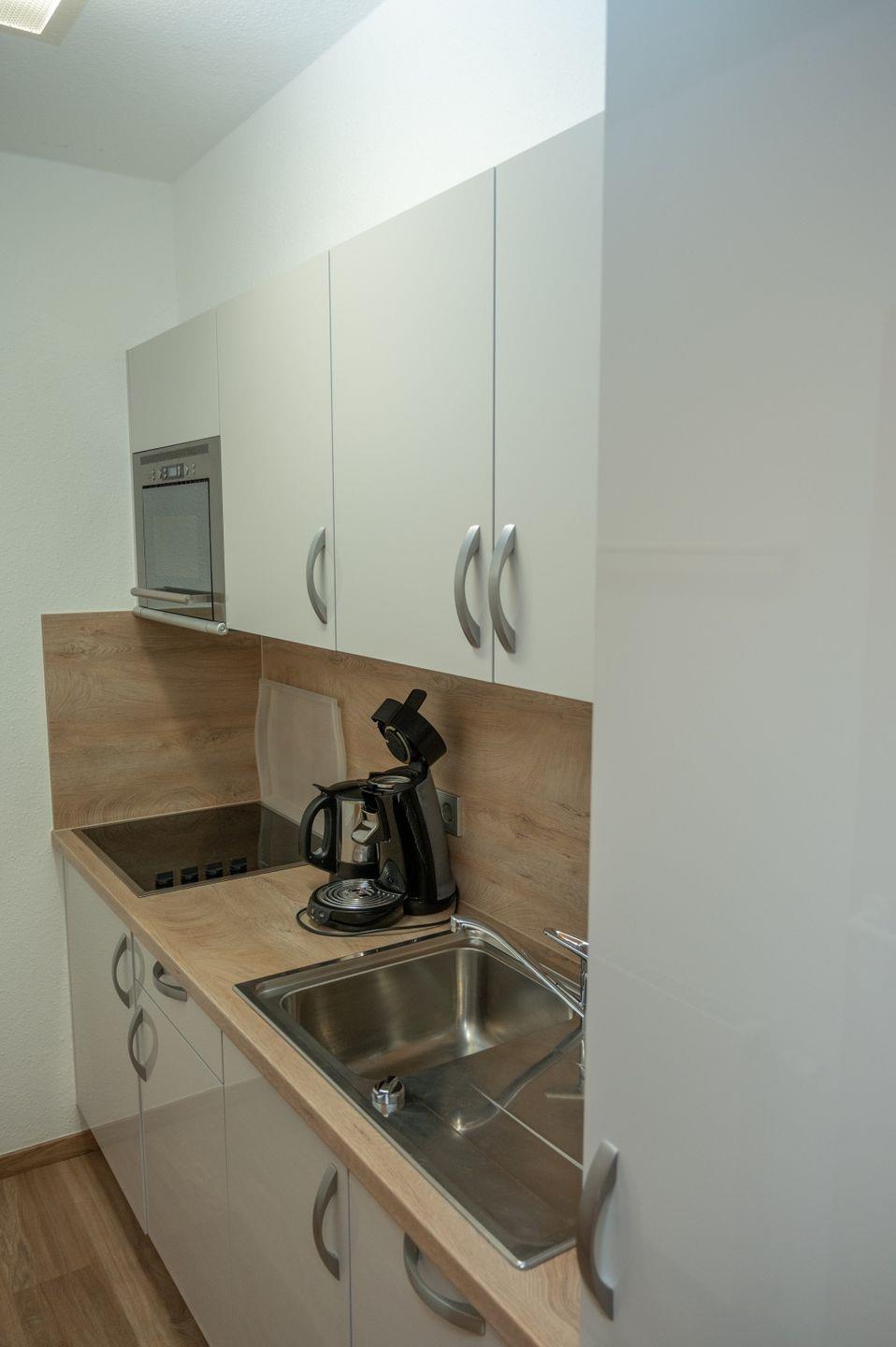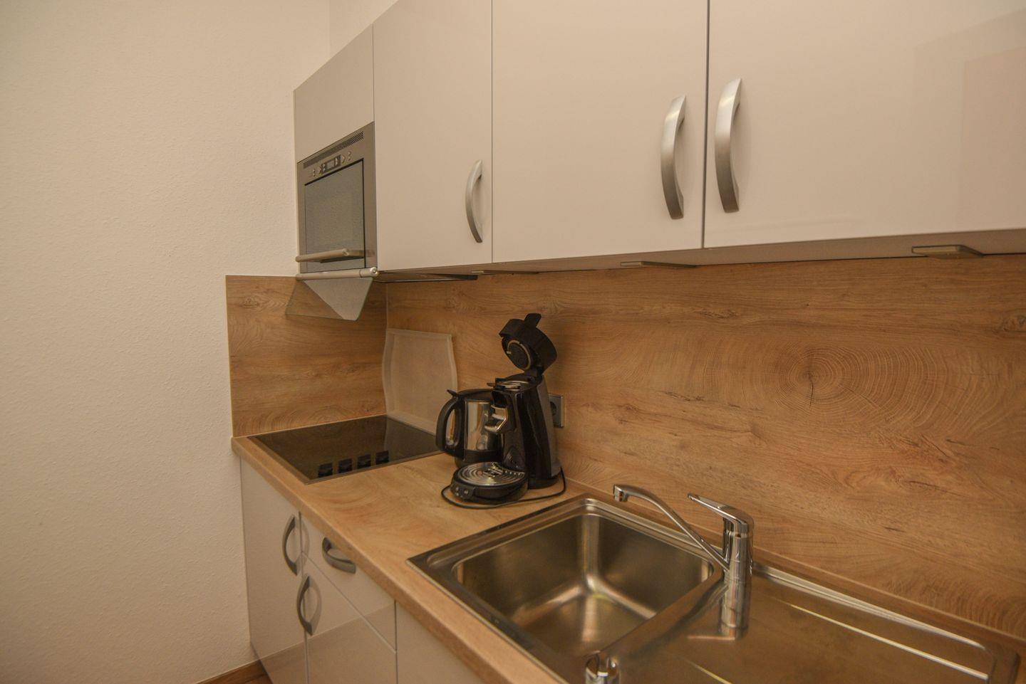 Das Herzstück der Wohnung ist das lichtdurchflutete Wohnzimmer, das mit einem komfortablen Sofa und einem Esstisch ausgestattet ist, an dem Sie gemeinsame Mahlzeiten genießen können. Ein TV-Gerät sorgt für Unterhaltung an gemütlichen Abenden. Die moderne, geschlossene Küche ist mit hochwertigen Geräten wie einer Spülmaschine, Mikrowelle, Ceran-Herd und Kühlschrank ausgestattet, sodass Sie ganz nach Lust und Laune kochen können. Hier finden Sie zudem alle erforderlichen Küchenutensilien, um kulinarische Köstlichkeiten zuzubereiten.
