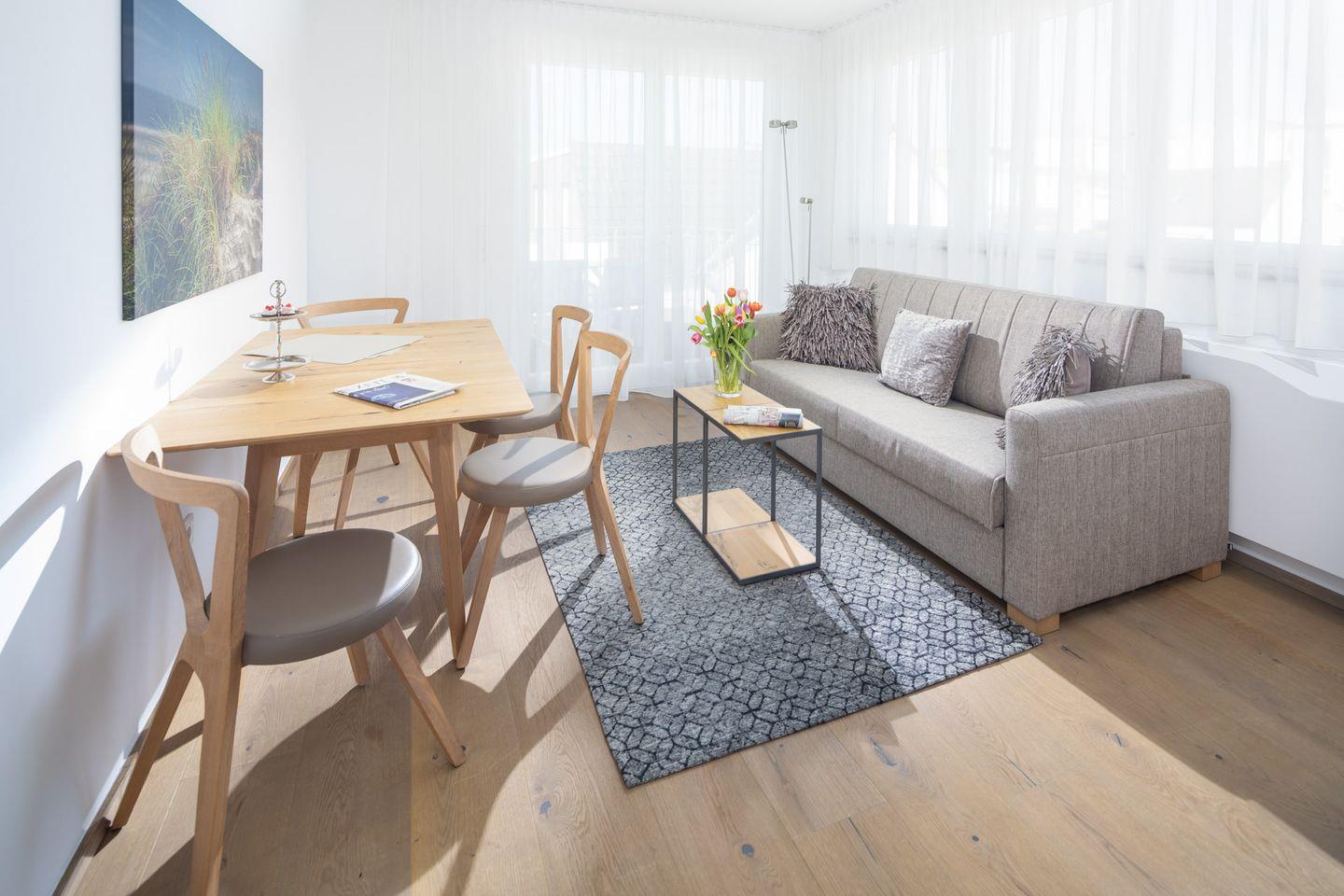 Der lichtdurchflutete Wohn- und Schlafraum ist offen und modern gestaltet. Ein hochwertiges Boxspringbett (180x200 cm) bietet exzellenten Schlafkomfort. Für eine dritte Person oder gemütliche Abende ist zusätzlich ein Schlafsofa (130x160 cm) vorhanden. Die Möblierung ist bewusst reduziert, hochwertig und durchdacht – ideal für alle, die auch im Urlaub Wert auf Design und Großzügigkeit legen.