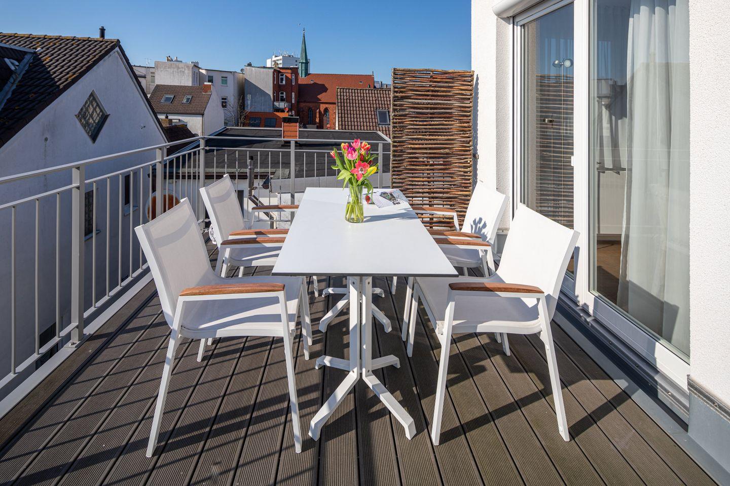 Trotz ihrer zentralen Stadtlage liegt das Kapitänsdeck angenehm ruhig in einer Seitenstraße. In wenigen Minuten erreichen Sie zu Fuß Strand, Promenade, Restaurants, Cafés und Geschäfte – alles direkt vor der Haustür, aber ohne Lärm oder Trubel. Die perfekte Kombination aus urbanem Komfort und entspannter Inselruhe.