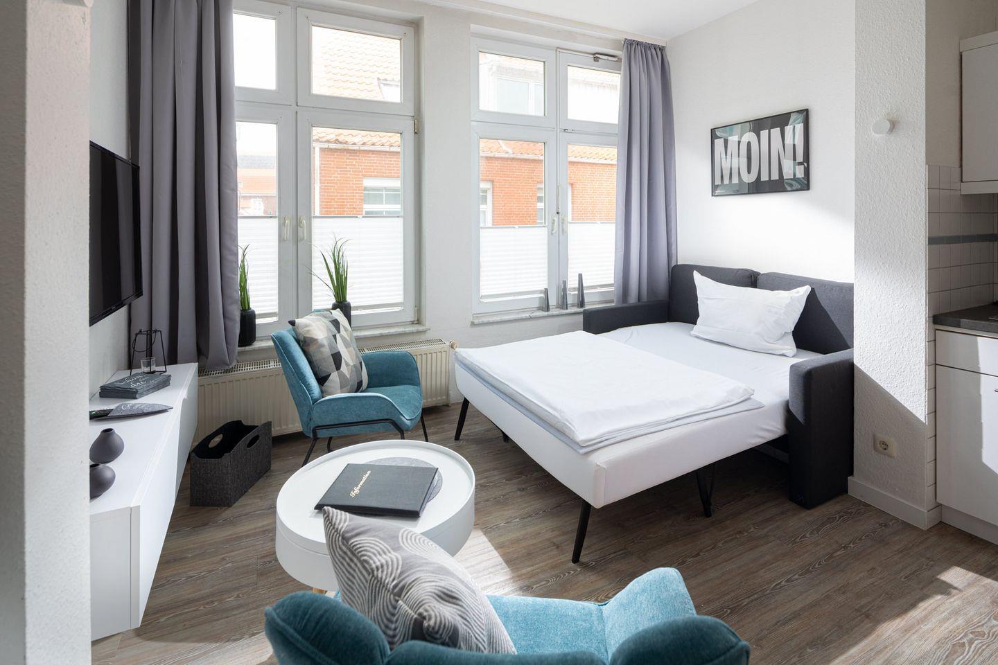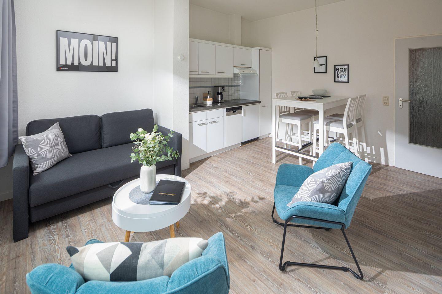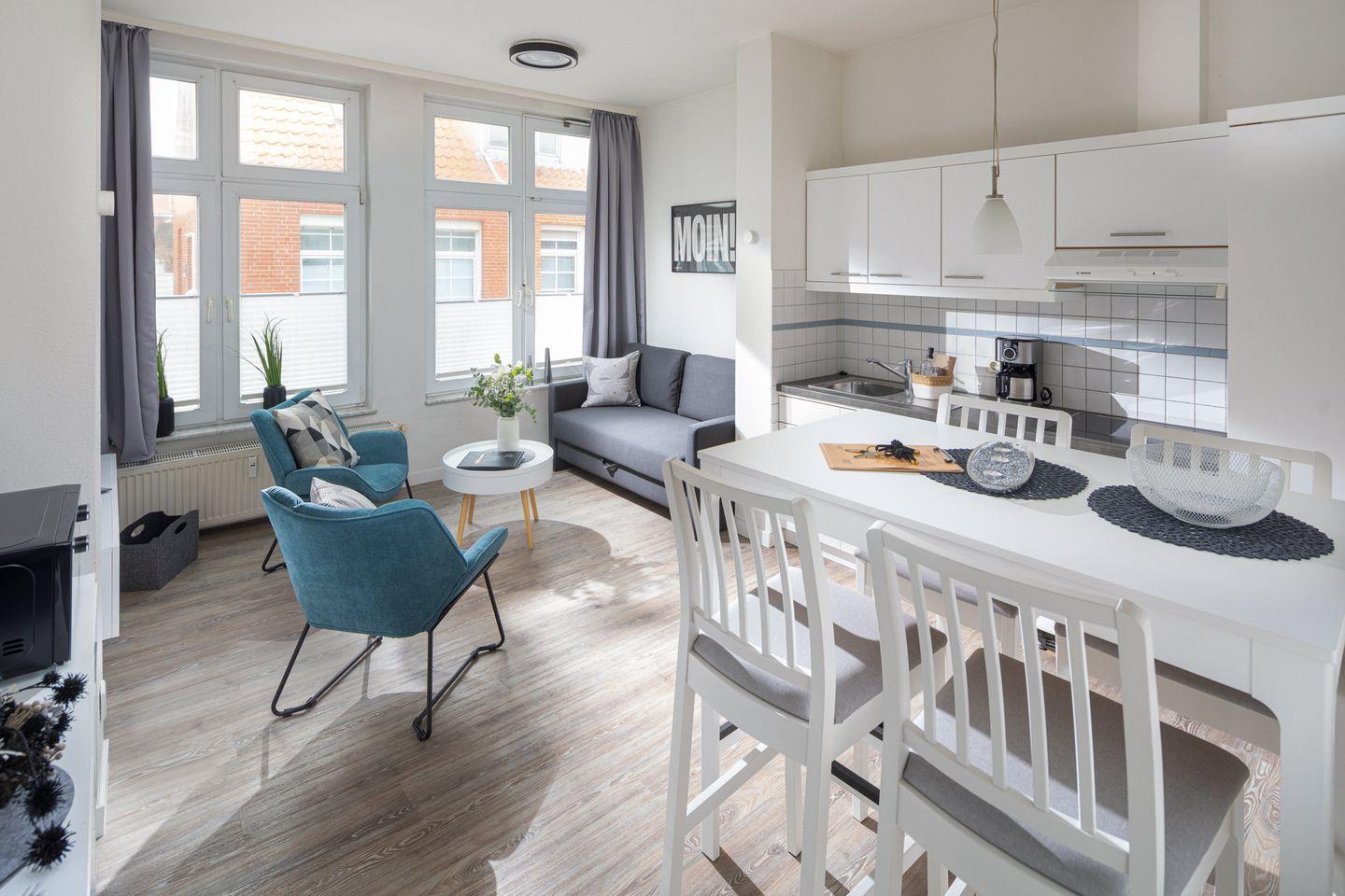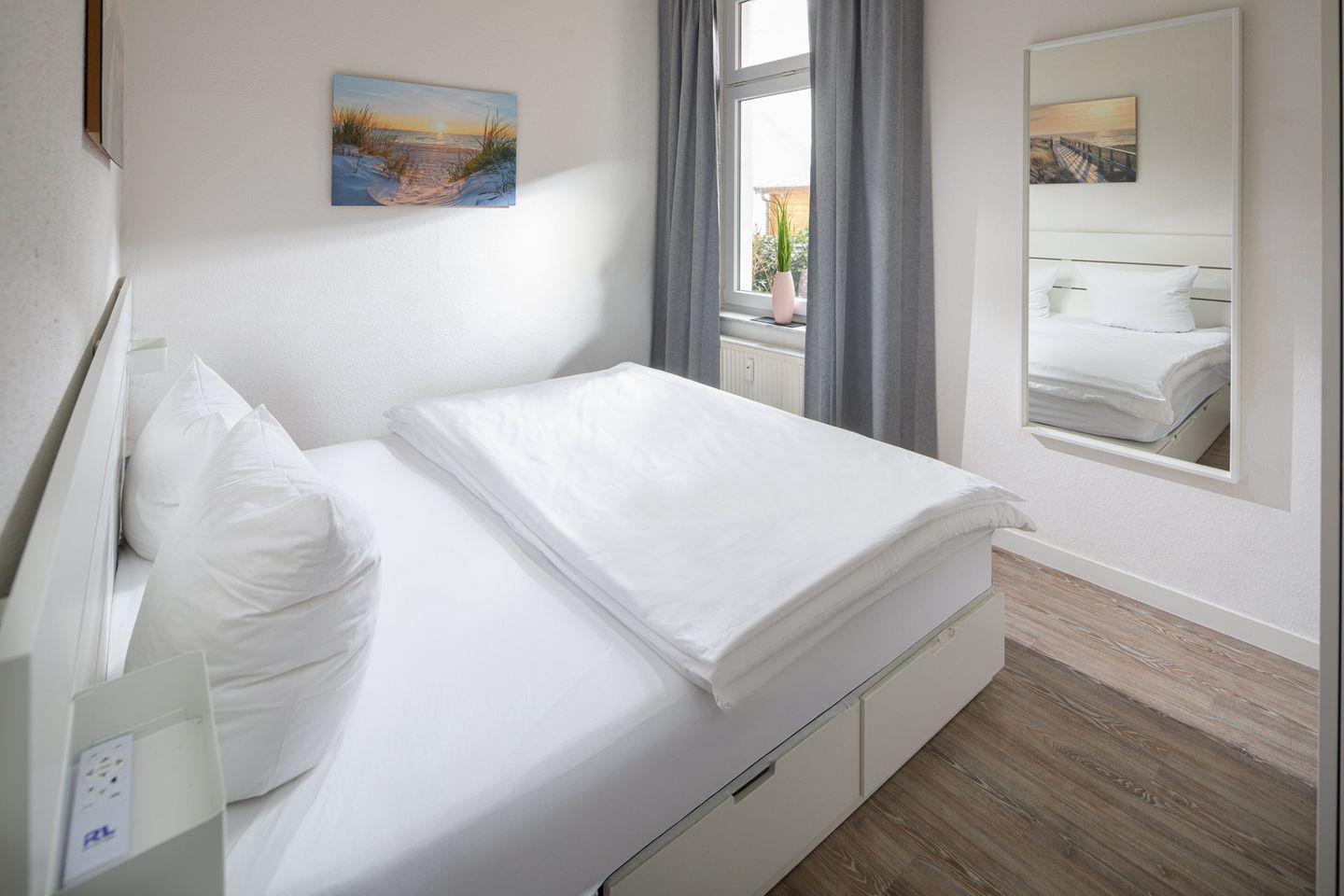 Die Wohnung 2 im Haus „Regina Maris“ liegt im Hochparterre und bietet auf ca. 40 m² alles, was Sie für einen angenehmen Aufenthalt benötigen. Die Wohnung umfasst ein Schlafzimmer mit einem komfortablen Doppelbett der Größe 180x200cm, ein Wohnzimmer mit integrierter Küche sowie ein Badezimmer mit Dusche und WC.
