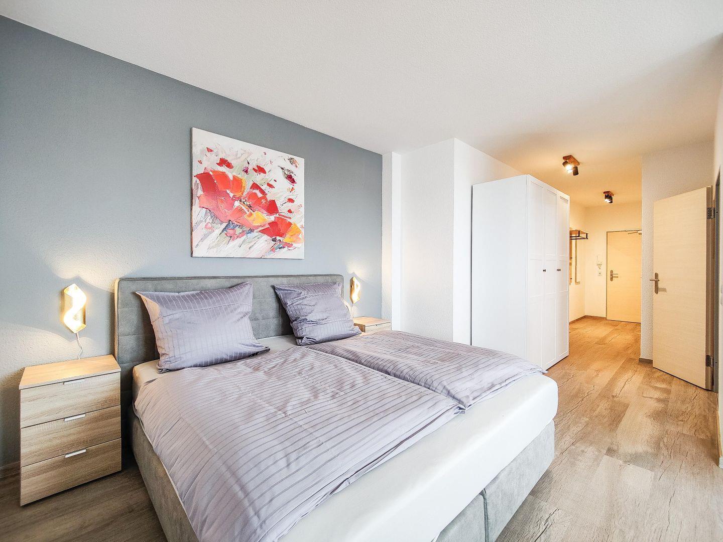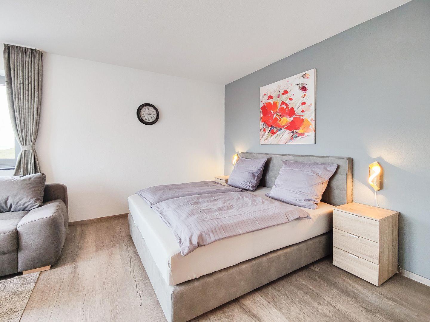 Die geschlossene Küche ist komplett ausgestattet mit Herd, Spülmaschine, Mikrowelle, Kühlschrank, Kaffeemaschine, Toaster und Wasserkocher – perfekt für gemütliche Frühstücke oder romantische Abendessen. Am Esstisch kannst du gemeinsame Mahlzeiten genießen, während die Sofaecke im Wohnzimmer zum Entspannen einlädt. WLAN und ein moderner TV sorgen für Unterhaltung.