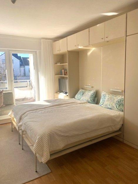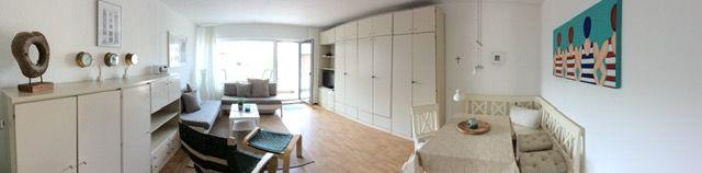 Die gemütliche 1-Raum-Ferienwohnung (ca. 38qm²) verfügt über einen hellen Wohn-/Schlafraum mit zwei komfortablen Schrankbetten, Sofas (TV) sowie Essbereich. Im Eingang zur Wohnung befindet sich die kleine, moderne Küchenzeile mit 2-Platten-Herd und Kühlschrank sowie Zugang zum Badezimmer mit Dusche/ WC. Der nach Westen ausgerichtete Balkon lädt zum Sonnenbaden ein. Fahrstuhl vorhanden.