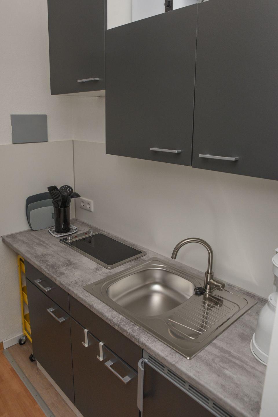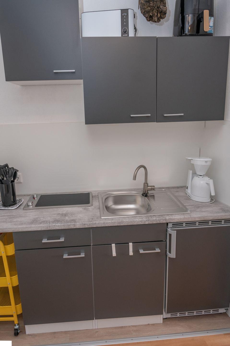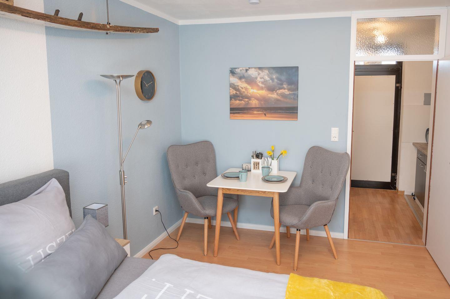 Auf 25 Quadratmetern erwartet Sie eine geschmackvoll eingerichtete Unterkunft, die sämtliche Annehmlichkeiten bietet. Das Wohnzimmer wurde mit einem modernen Laminatboden ausgestattet und bietet Ihnen mit einer gemütlichen Sitzecke und einem 42 Zoll Fernseher den idealen Platz, um entspannte Abende zu verbringen. Darüber hinaus verfügen Sie über eine Kochnische, die mit einem Cerankochfeld, Kühlschrank, Wasserkocher, Toaster, Airfryer und einer Kaffeemaschine ausgestattet ist. Hier können Sie sich nach einem erlebnisreichen Tag selbst Ihre Lieblingsgerichte zubereiten. Natürlich finden Sie auch Geschirr und Besteck in der Küche, um die Mahlzeiten ganz bequem genießen zu können.