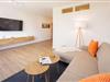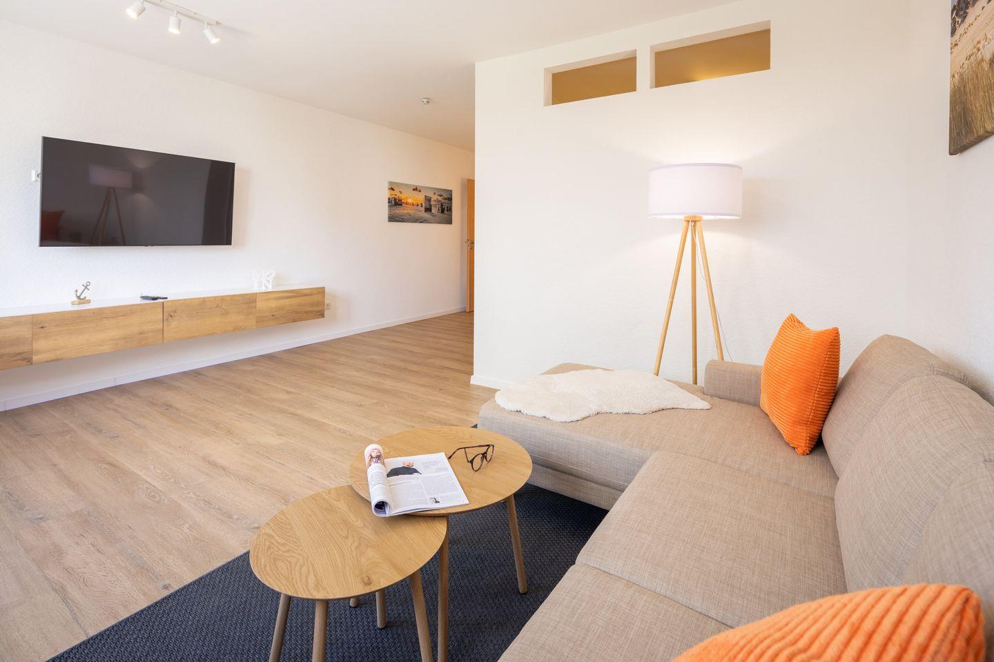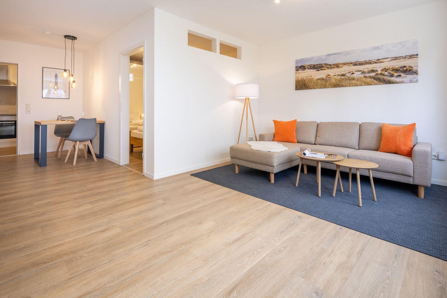 Beim Betreten der Wohnung gelangen Sie über einen kleinen Flur direkt in den offenen Wohnbereich in L-Form. Hier laden eine gemütliche Couchgarnitur, ein großer Flatscreen-TV und eine praktische Essecke zum Verweilen ein.