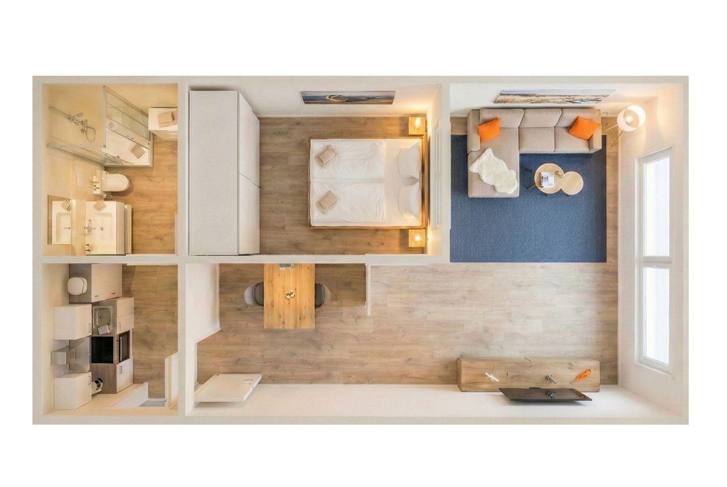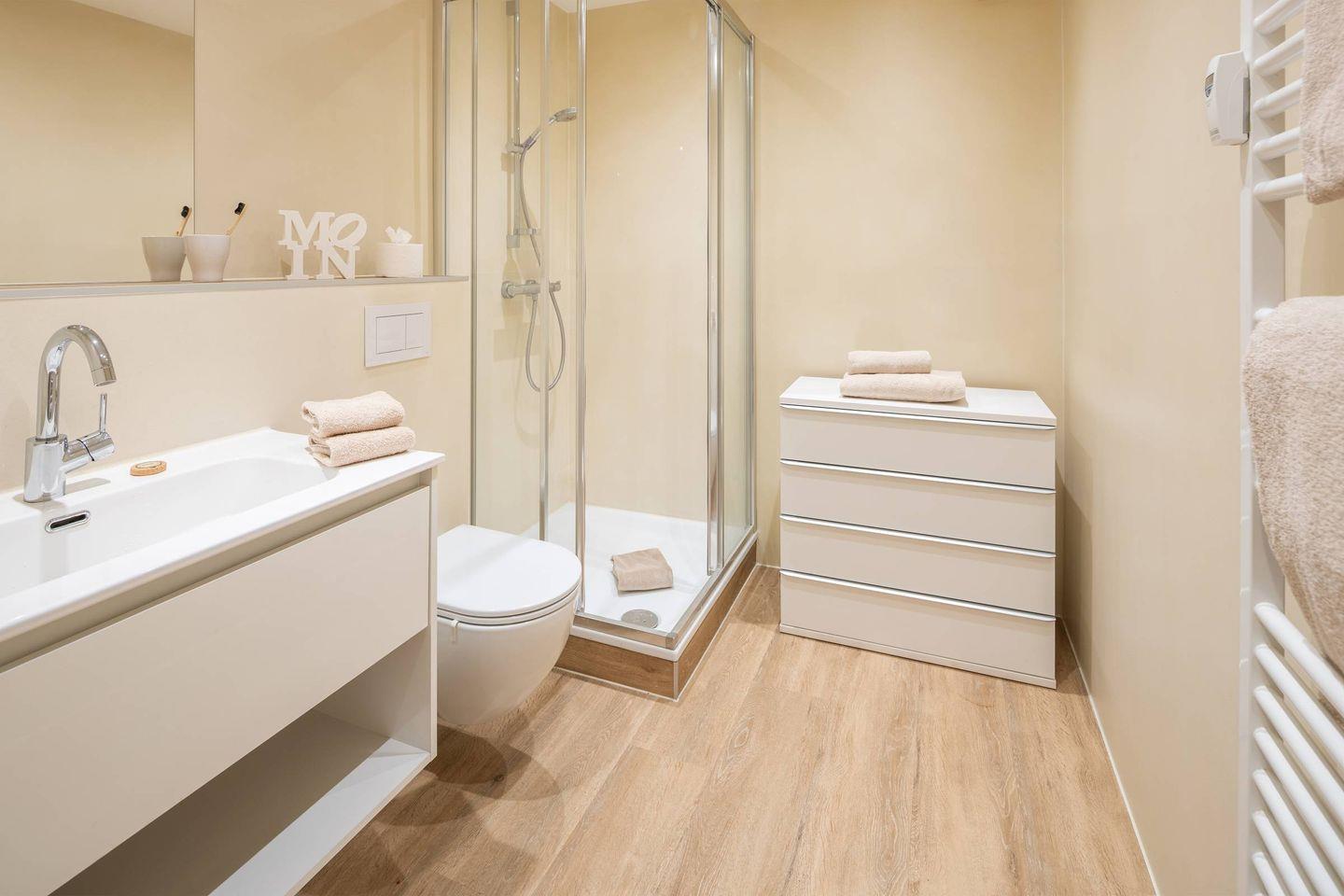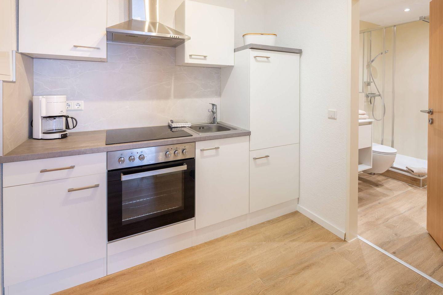 Die separate Küchenzeile ist funktional ausgestattet – perfekt für die kleine Mahlzeit zwischendurch. Das moderne Bad verfügt über eine Dusche, WC und Waschbecken.