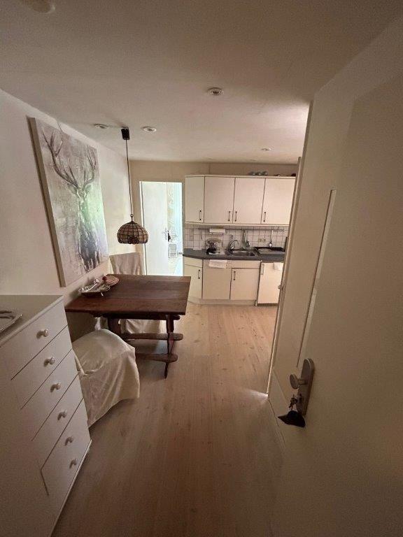 Die Küche ist geschlossen und modern ausgestattet. Hier finden Sie alle notwendigen Küchenutensilien, einen Ceran-Herd, Backofen mit Elektroanschluss, Kühlschrank mit separatem Gefrierfach, Mikrowelle, Toaster, Kaffeemaschine sowie eine Nespresso-Espressomaschine. Geschirr, Besteck und Geschirrhandtücher sind ebenfalls vorhanden. Ein Essbereich mit einem Esstisch schafft einen einladenden Rahmen für Mahlzeiten. Das Angebot wird durch eine Geschirrspülmaschine ergänzt, die den Abwasch erleichtert.