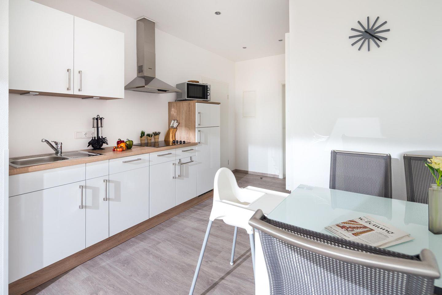 Die Küche ist geschickt auf kleinem Raum geplant, aber voll ausgestattet – inklusive Geschirrspüler –, sodass ihr euch nach Herzenslust selbst bekochen könnt. Der Wohnbereich lädt mit dem Schlafsofa und einem TV zum Entspannen ein. Direkt angrenzend genießt ihr euren Kaffee am Esstisch, umgeben vom sanften Tageslicht.