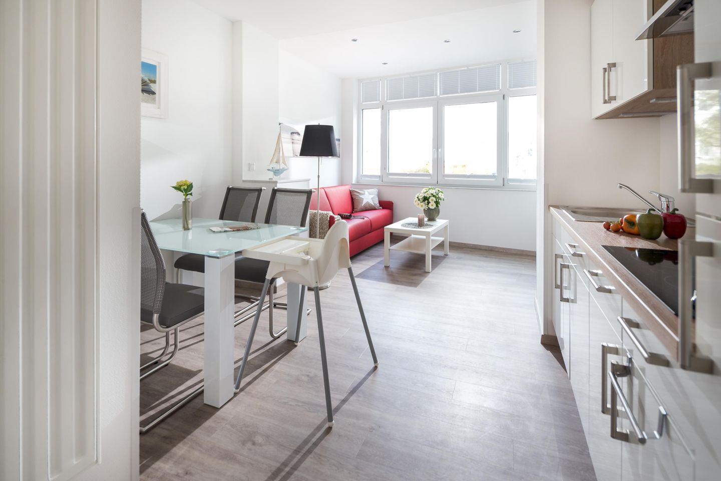 Auf ca. 37?m² erwartet euch eine hell und modern eingerichtete Ferienwohnung – perfekt für zwei bis vier Personen, die zentral wohnen und gleichzeitig entspannte Inselmomente genießen wollen. Die Wohnung verzaubert mit ihrem offenen Flair: Wohnbereich mit gemütlichem Federkern-Schlafsofa, separate Küchenzeile und ein separat gelegener Schlafbereich mit komfortablem Boxspringbett.