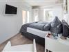 Ein paar Stufen führen nach unten, wo das separate Schlafzimmer mit großzügigem Boxspringbett wartet – ruhig, hell und ideal für erholsame Nächte. Das Duschbad ist modern und freundlich gestaltet, mit ebenerdiger Dusche, Waschtisch, großem Vergrößerungsspiegel und WC – eine stilvolle und funktionale Rückzugsoase.