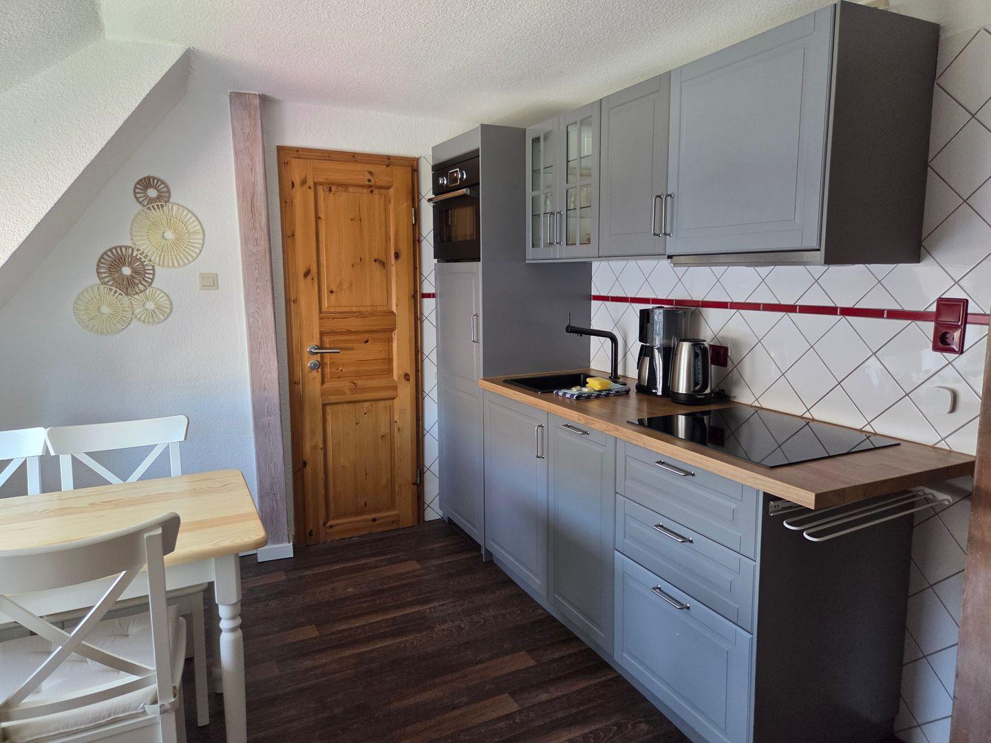 Das helle Wohnzimmer mit Sofaecke und angrenzender offener Küche bildet den Mittelpunkt der Wohnung. Ein Flachbildfernseher und ein Radio sorgen für Unterhaltung. Die Küche ist ausreichend ausgestattet – u.?a. mit Kühlschrank inkl. Gefrierfach, Spülmaschine, Mikrowellen-Backofenkombination, Induktionsherd, Kaffeemaschine, Senseo-Maschine, Toaster und Wasserkocher.