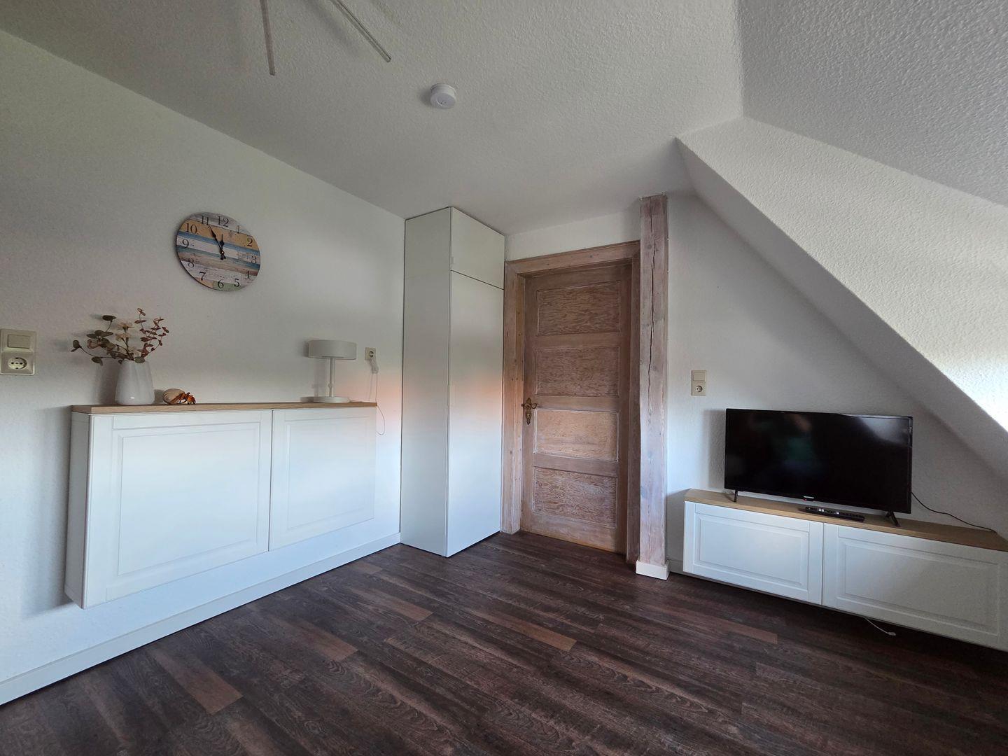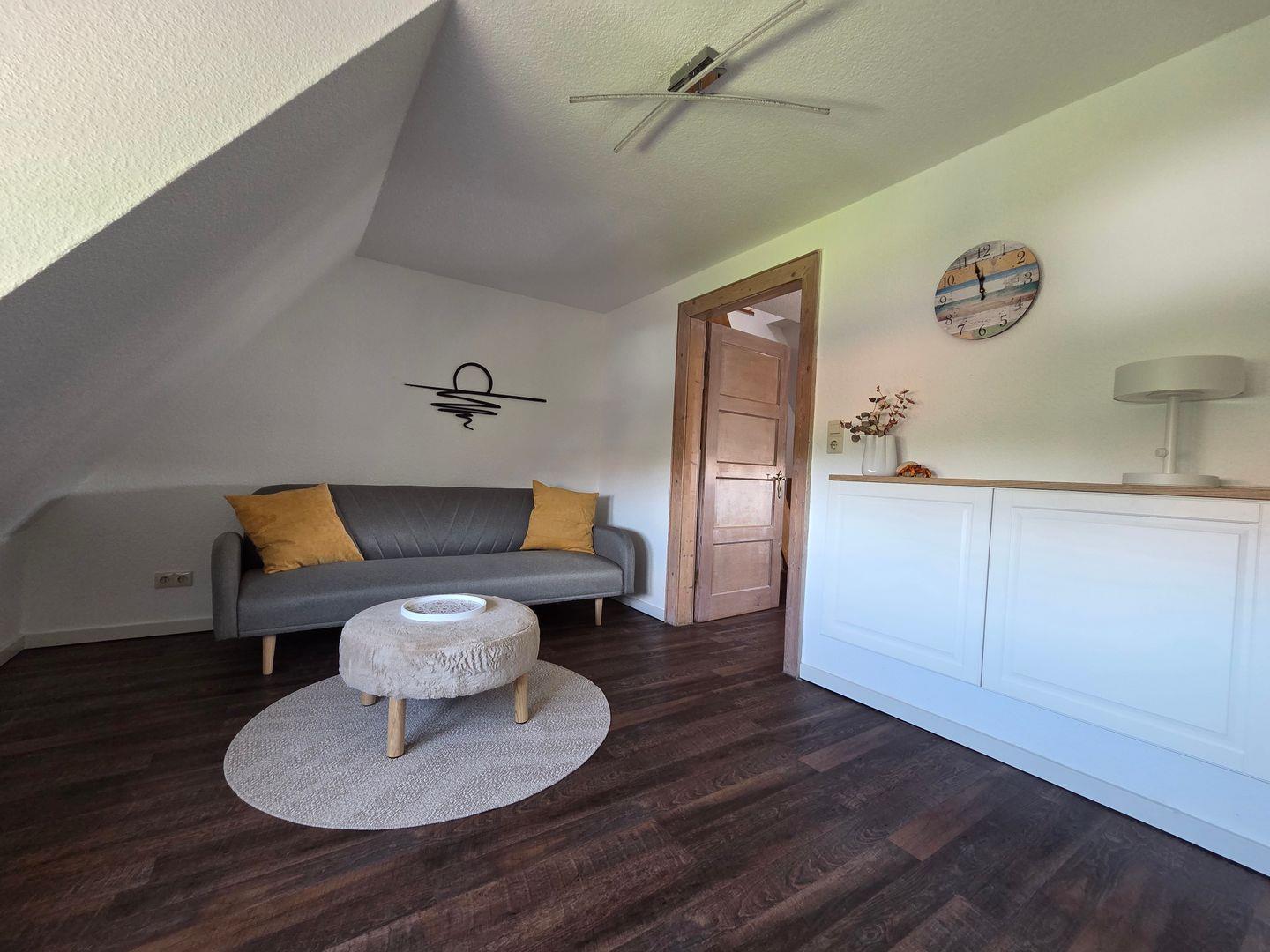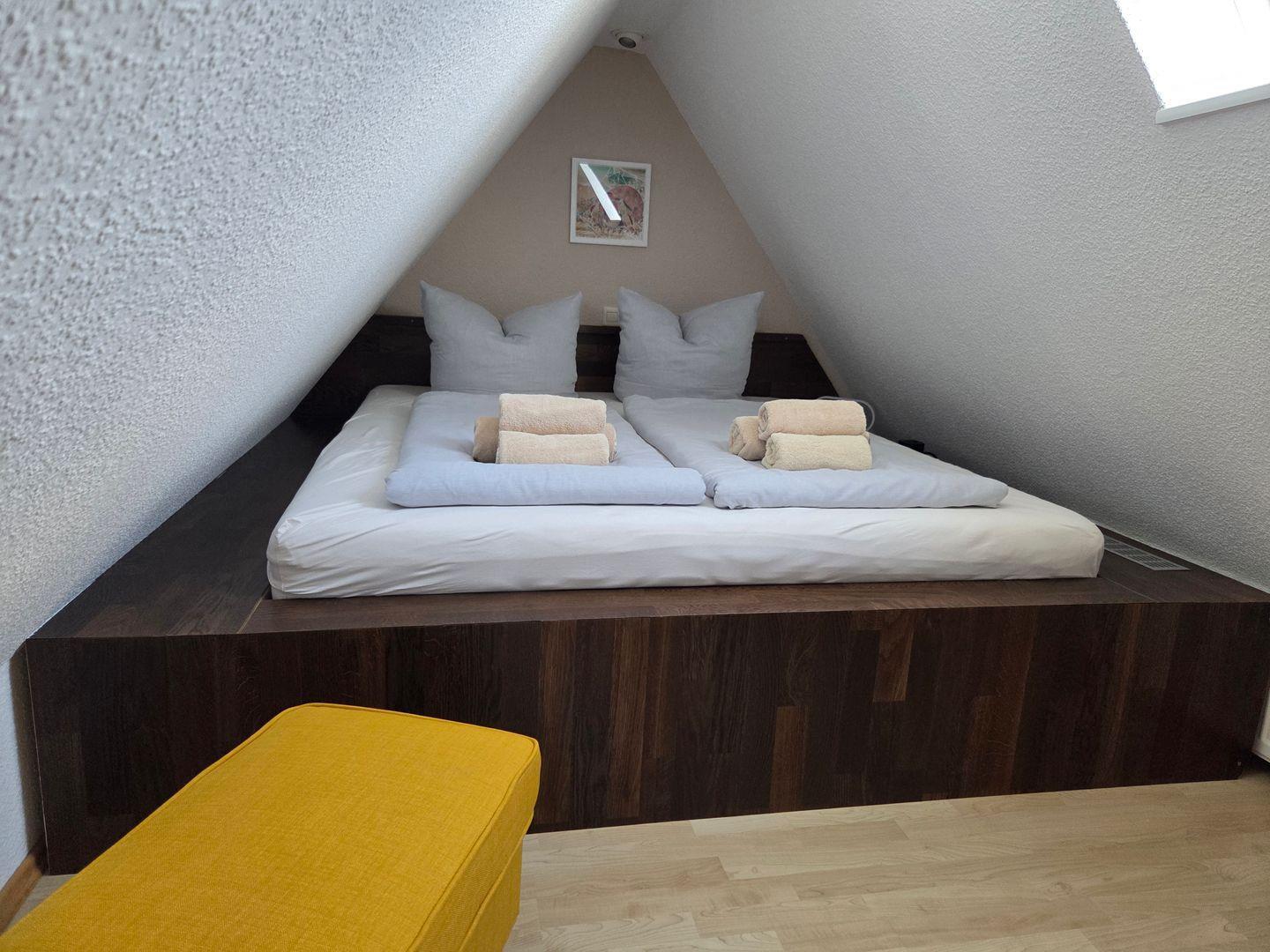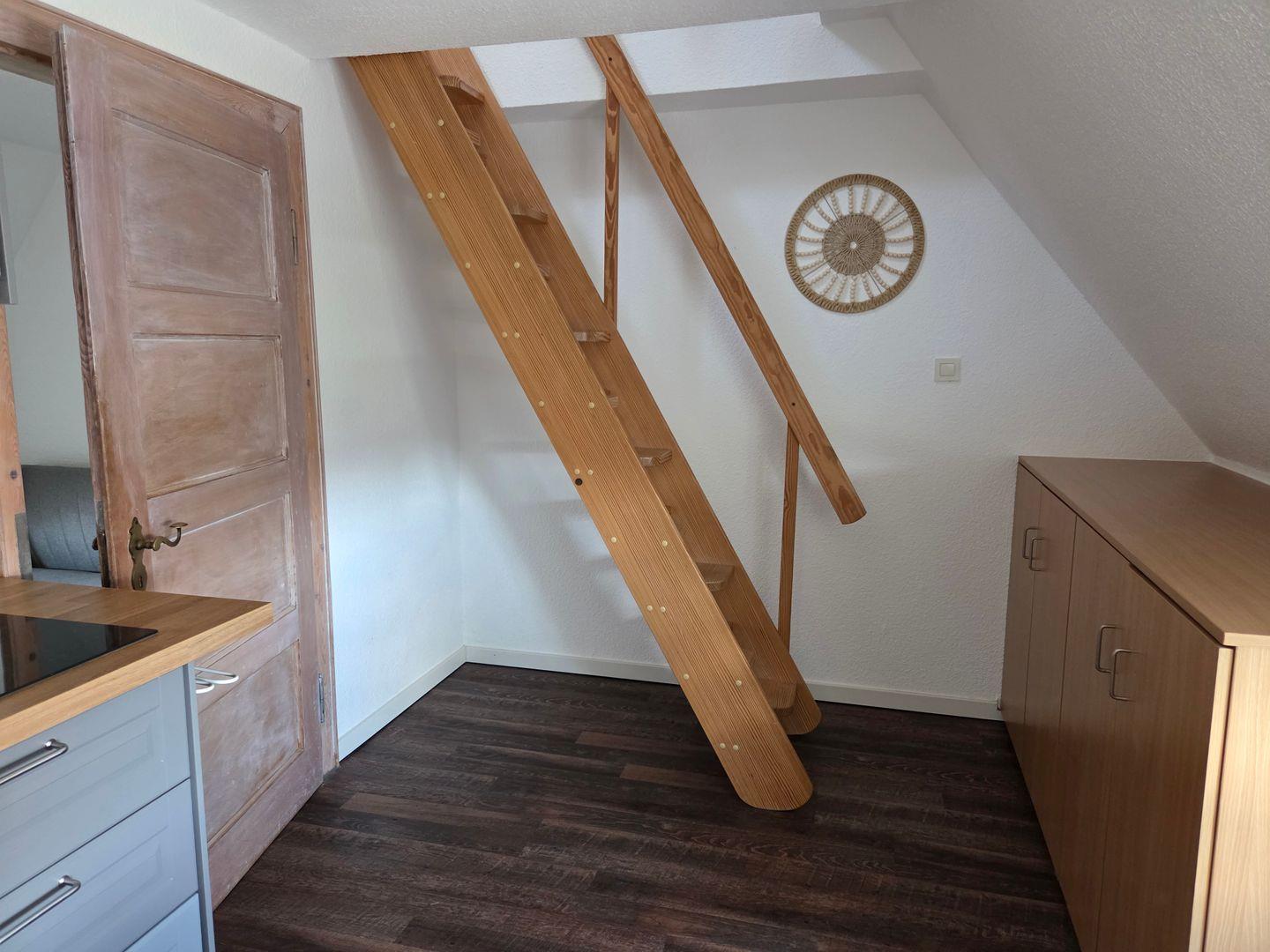 Die Unterkunft liegt im 1. Obergeschoss und erstreckt sich über zwei Ebenen. Sie verfügt über ein separates Schlafzimmer mit Platz für zwei Personen, welches Sie über eine Raumspartreppe im Essbereich erreichen. Bettwäsche und Handtücher sind vorhanden.