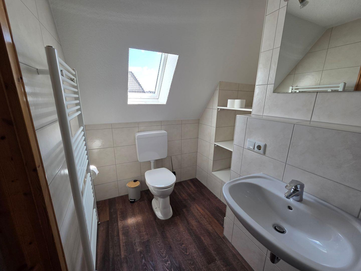 Das moderne Badezimmer ist mit Fenster, Dusche, WC, Kosmetikspiegel und Haartrockner ausgestattet. Sichtschutz an allen Fenstern sorgt für Privatsphäre.