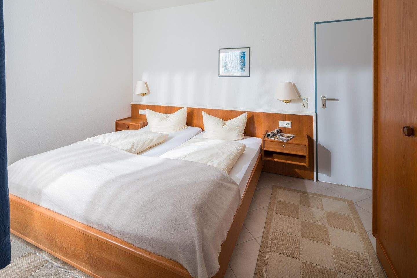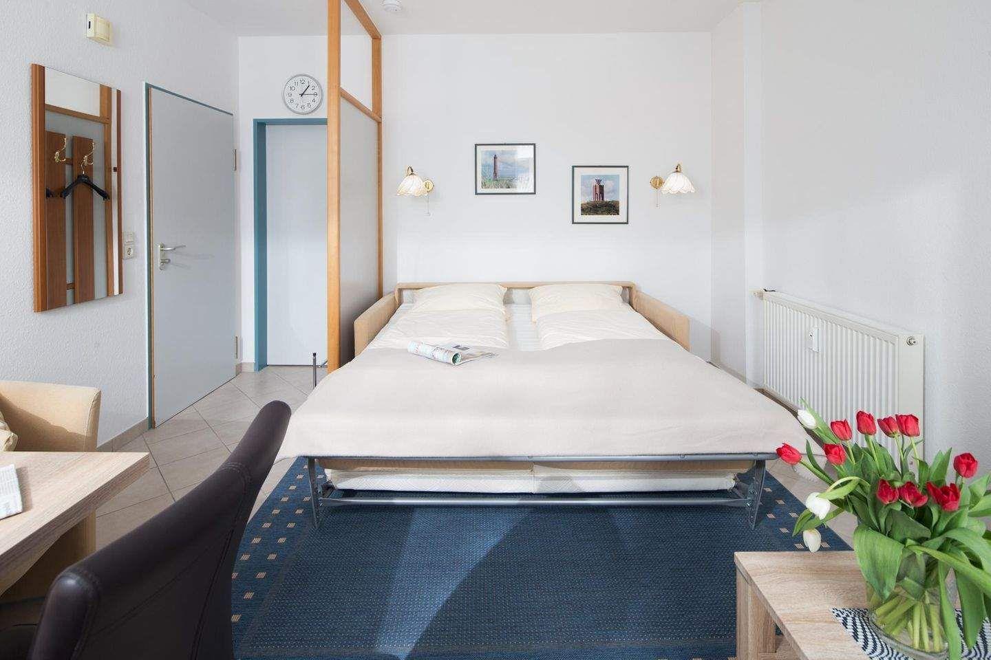 Die Wohnung verfügt über ein Schlafzimmer mit einem Doppelbett und ein Wohnzimmer mit einer Ausziehcouch, die bei Bedarf 1-2 weiteren Personen Platz bietet. Die Küchenzeile ist voll ausgestattet. Das Badezimmer ist mit einer Dusche und einem WC ausgestattet. Ein besonderes Highlight der Wohnung "Regina Maris 6" ist die großzügige Balkkon, die nach Osten ausgerichtet ist. Hunde sind in dieser Wohnung nicht erlaubt.