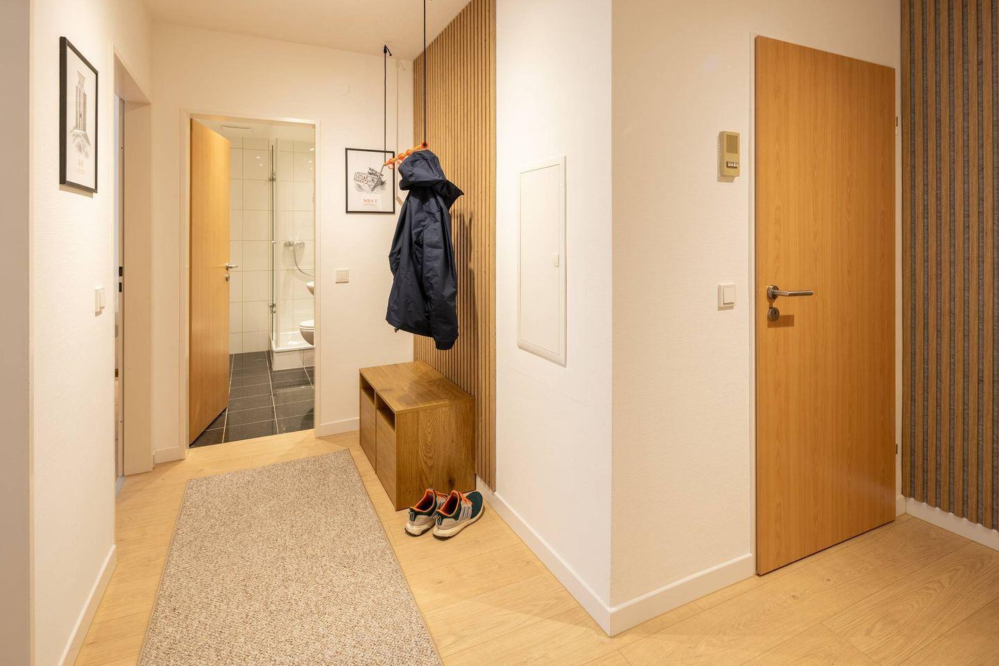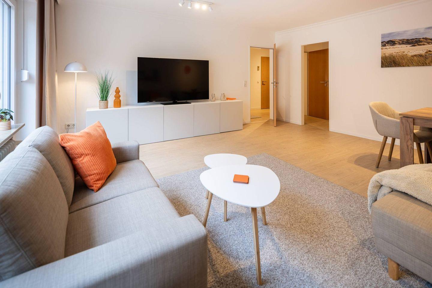 Über den Flur sind alle Räume bequem erreichbar. Der helle Wohnbereich mit gemütlichen Sofas, großem Flat-TV und moderner Essecke lädt zum Entspannen ein. Direkt angrenzend befindet sich die separate Küche mit praktischer Theke – ideal für kleine Mahlzeiten oder den Kaffee zwischendurch.