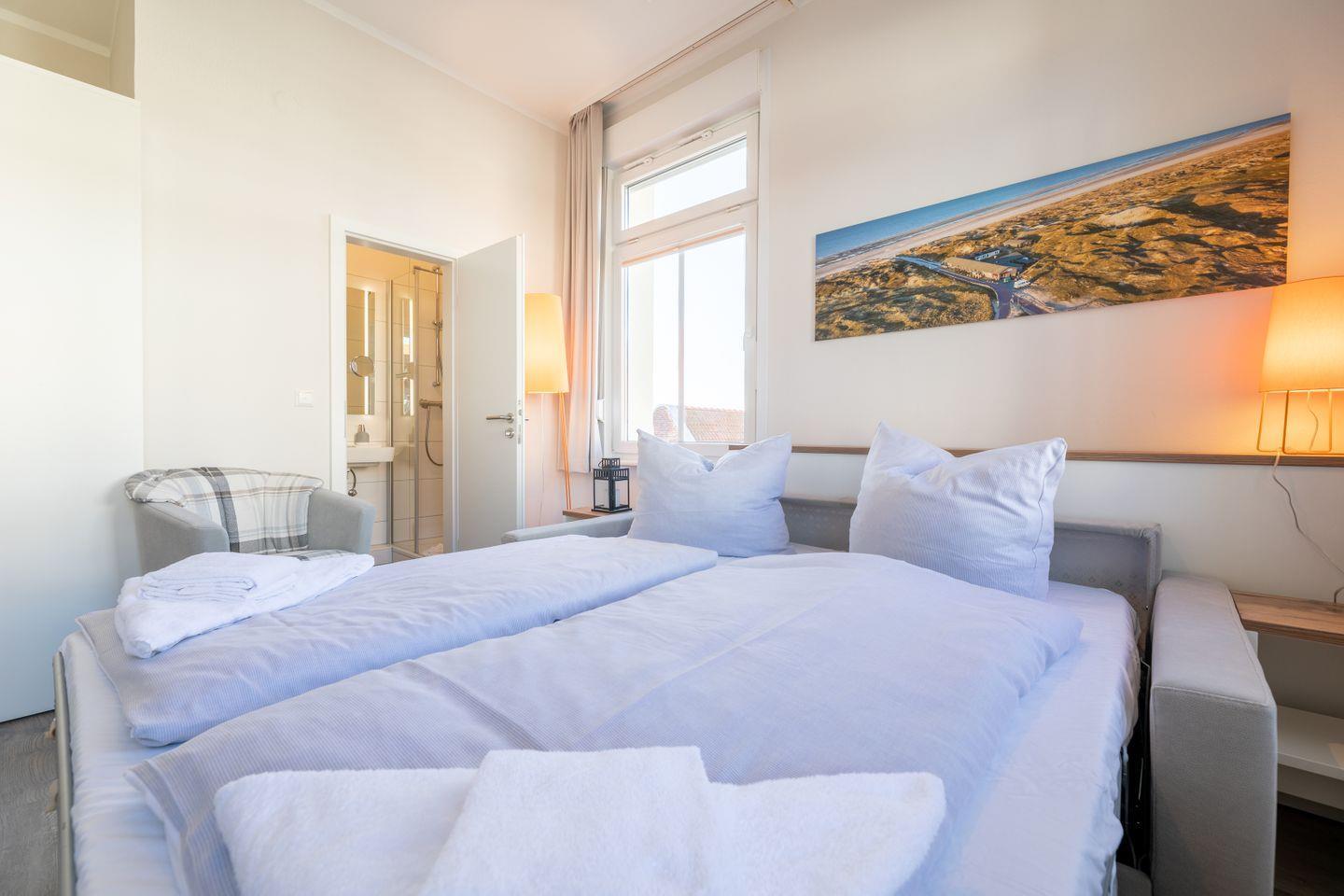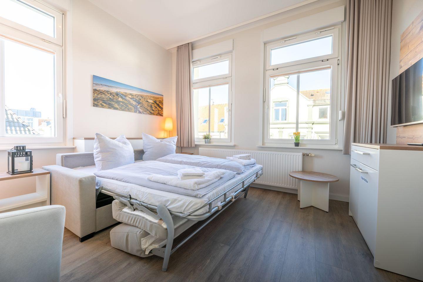 Kajüte 5 im Ferienhaus Inselanker ist eine moderne, helle Einraumwohnung auf 28 m² im 1. Obergeschoss (Deck 2) für bis zu 2 Personen. Die gemütliche Sitzecke mit TV und ausziehbarem Schlafsofa lädt zum Entspannen ein, während die gut ausgestattete Küche mit kleinem Esstisch alles für Frühstück und kleine Mahlzeiten bietet. Das moderne Bad mit Dusche ergänzt den Komfort – ideal für Singles oder Paare, die das typische Norderneyer Urlaubsgefühl genießen möchten.