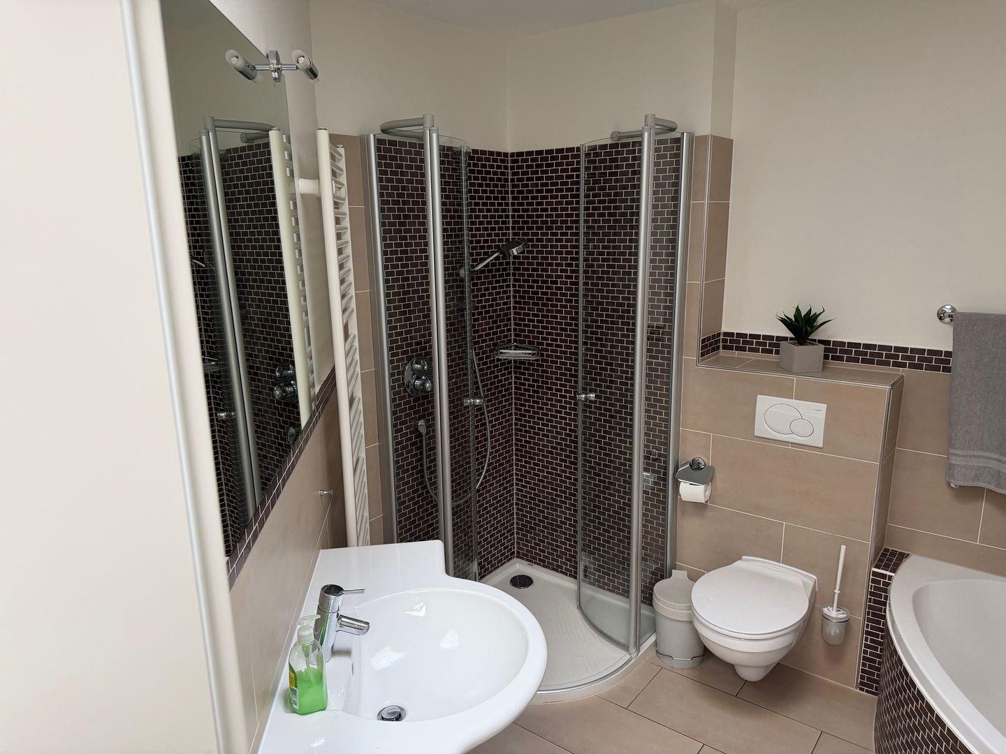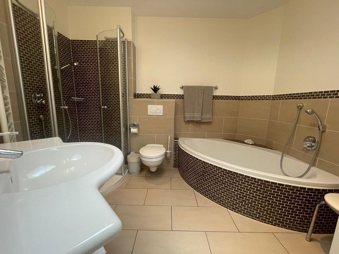 Das moderne Badezimmer bietet sowohl eine Dusche mit flachem Einstieg als auch eine gemütliche Eckbadewanne. Eine angenehme Fußbodenheizung sorgt für zusätzlichen Komfort.