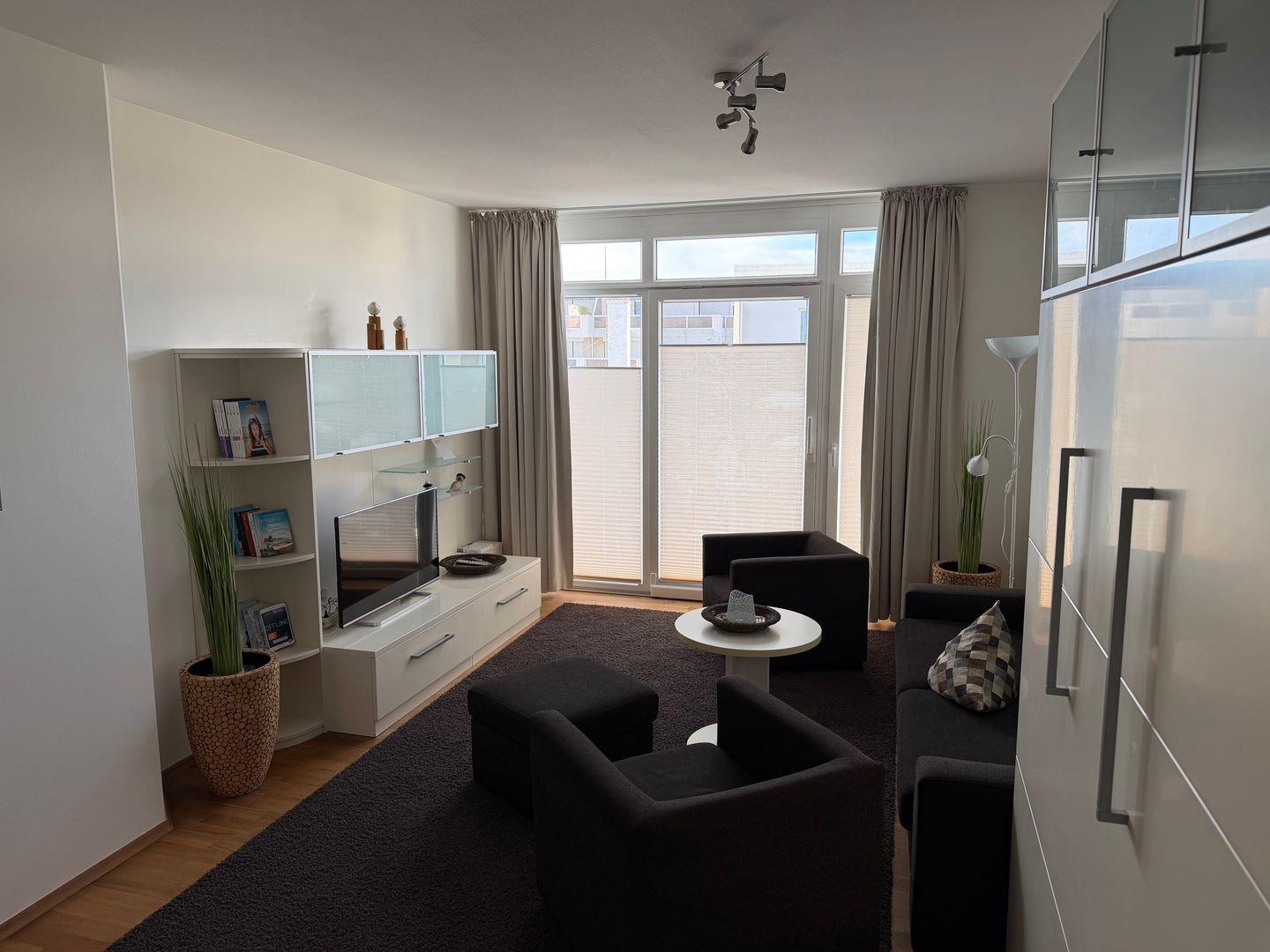 Das helle, freundliche Wohnzimmer lädt zum Verweilen ein – ob beim Lesen, bei einem gemütlichen Fernsehabend am Smart-TV oder einfach zum Abschalten.