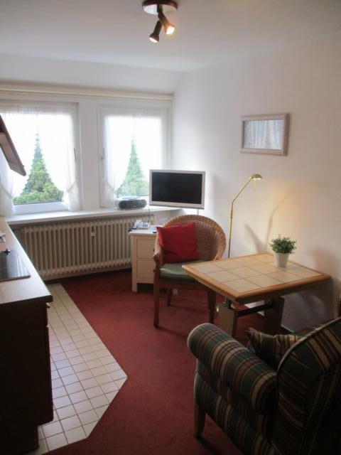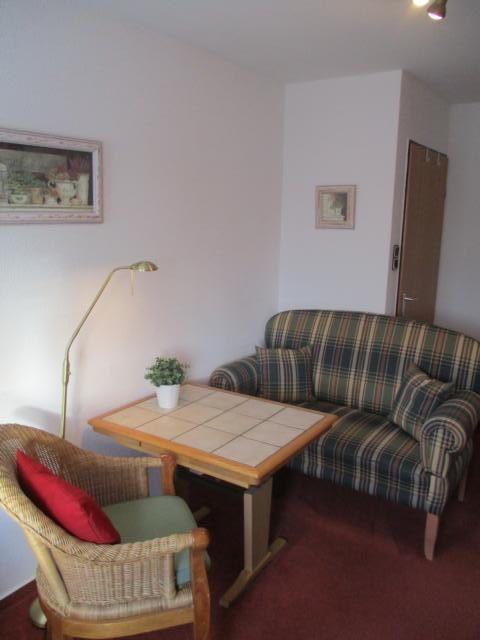 Der Wohnbereich ist gemütlich eingerichtet und mit Teppichboden versehen. Ein bequemes Sofa, ein Sessel sowie ein Esstisch und eine Garderobe sorgen für ein behagliches Ambiente. Zur Unterhaltung steht ein Kabel-TV (25–34 Zoll), Radio und WLAN-Internetzugang zur Verfügung. Für die Anreise ist bereits eine Erstausstattung an Bettwäsche und Handtüchern bereitgelegt; der Staubsauger gehört ebenso zur Ausstattung.