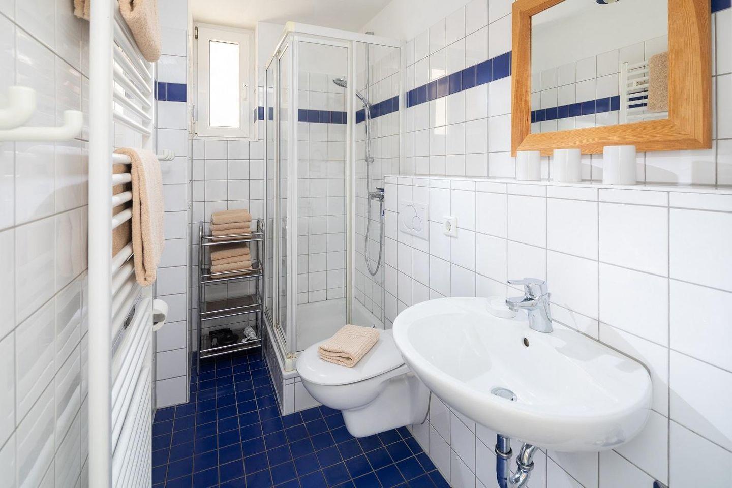 die beiden Schlafzimmer der zweckmäßig eingerichteten Wohnung im EG liegen sich gegenüber nach hinten raus. Das größere der beiden mit Doppelbett verfügt über ein zusätzliches TV, das andere ist mit zwei Einzelbetten ausgestattet.