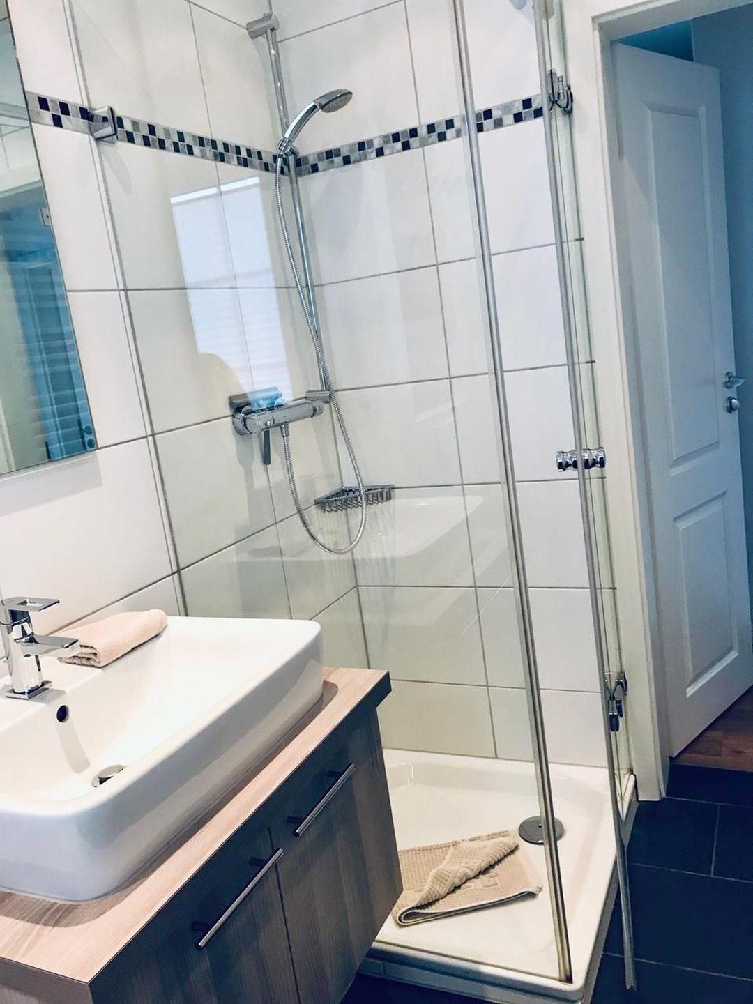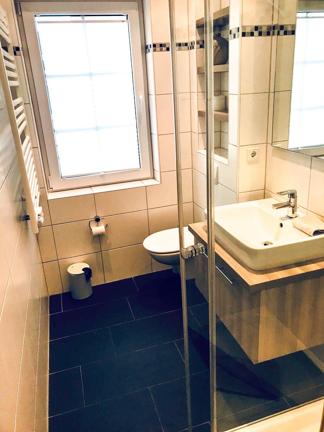Die obere Wohnung im 1. OG mit sonnigem Süd-West-Balkon vom Schlafzimmer (zwei Einzelbetten) ausgehend verfügt über ein Tageslichtbad mit Dusche/WC, einen Wohn-Schlafbereich (Schlafsofa) und eine voll ausgestattete Küchenzeile.