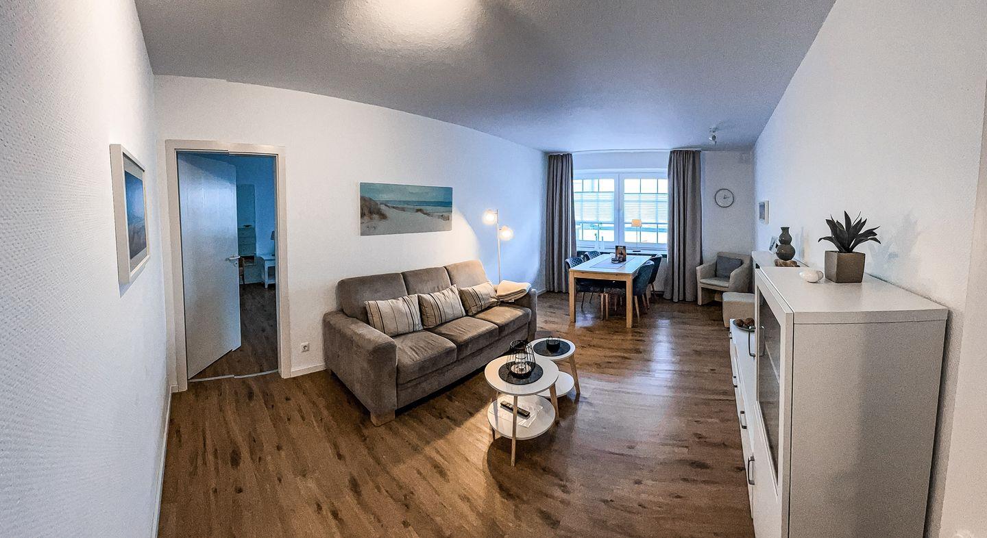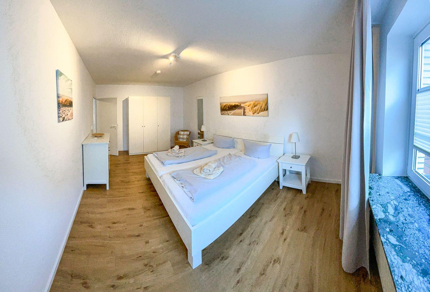 das geräumige Appartement im 1. OG verfügt über 2 separate Schlafzimmer (eines mit Doppel-/eines mit 2 Einzelbetten). Durch die separate voll ausgestattete Küche mit rundem Esstisch vor dem Fenster betreten Sie den Balkon, der nach hinten raus liegt. Badezimmer mit Dusche/WC. Im Wohnzimmer befindet sich eine zweite Essecke vor dem Fenster.