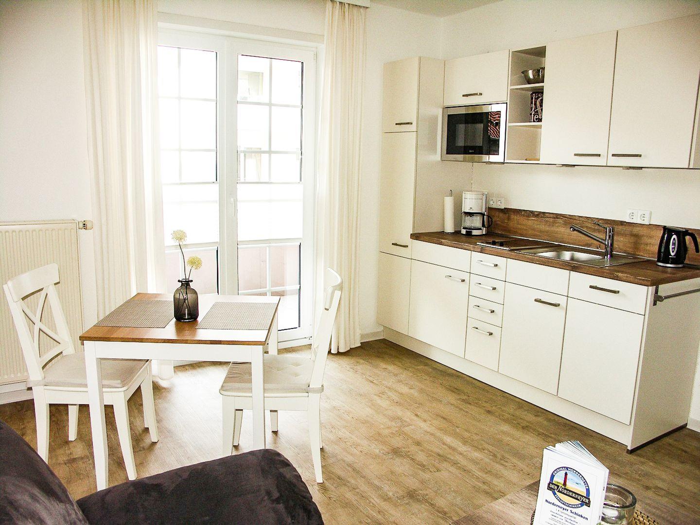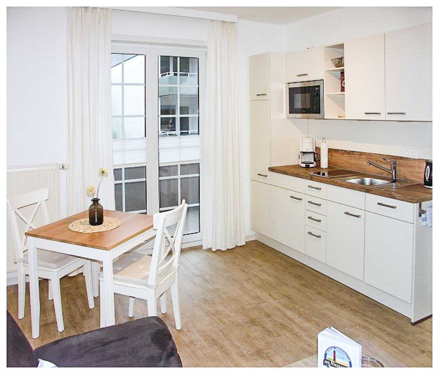 die Wohnung im 1. OG liegt mitten im Zentrum nach hinten raus und verfügt über ein separates Schlafzimmer mit Doppelbett, Wohnraum mit voll ausgestatteter Küchenzeile, Essecke und Bad mit Dusche/WC. Den Balkon können Sie sowohl vom Schlafzimmer als auch vom Wohnzimmer aus betreten. Bäcker, Lebensmittelgeschäfte und die Strandpromenade sind um zwei Straßenecken fußläufig zu erreichen.