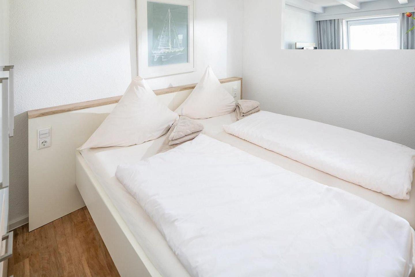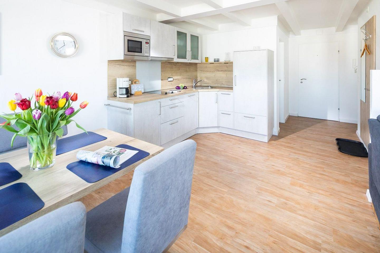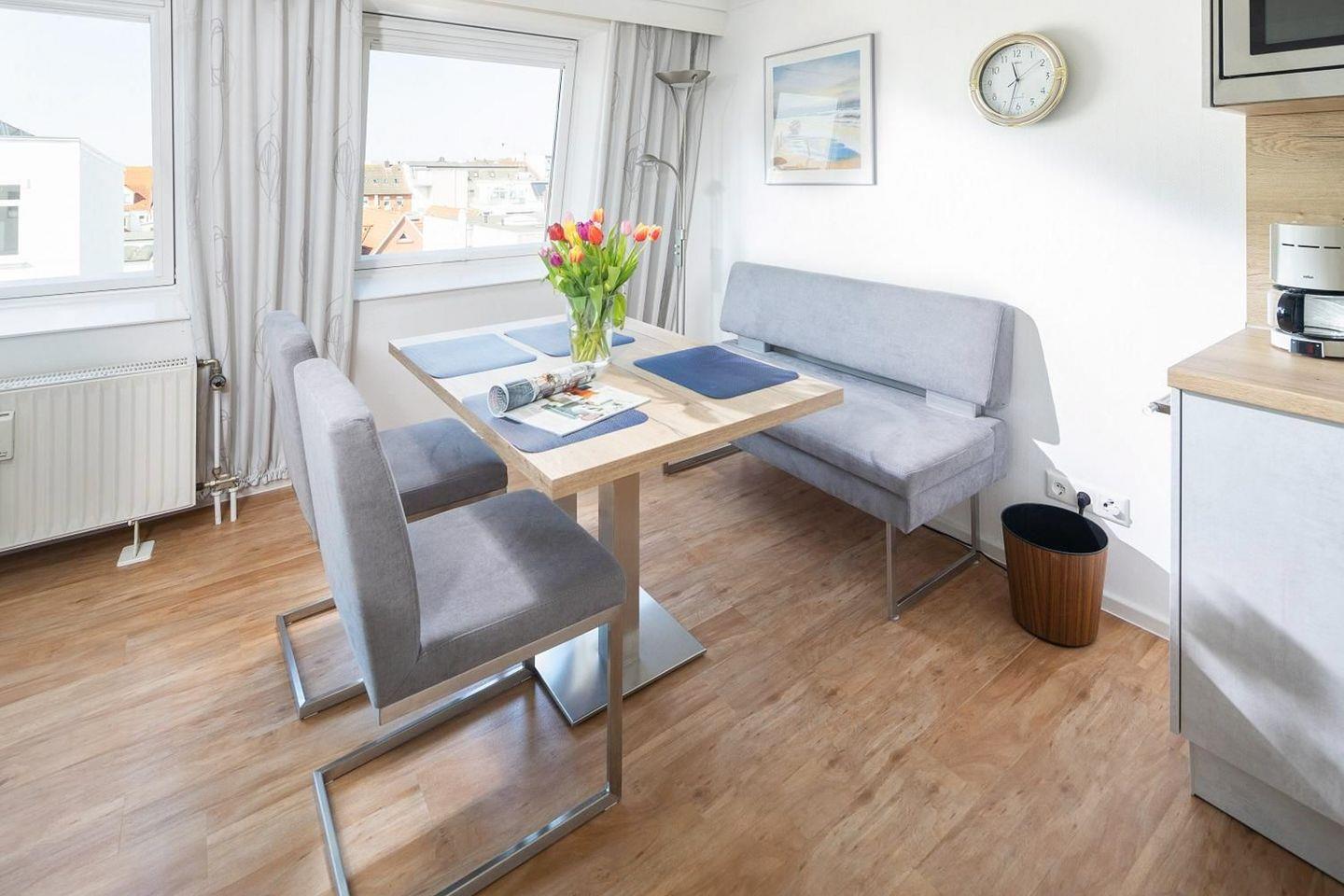 Das Appartement verfügt über eine Schlafnische mit feststehendem Doppelbett. Eine halbhohe Wohnwand trennt diese vom Wohn-Schlafbereich (Schlafsofa) ab. Die Essecke für 4 Personen und die voll ausgestattete Küchenzeile befinden sich direkt am Fenster. Badezimmer mit Dusche/WC. Die Strandpromenade am Meer ist nur die Moltkestraße rauf in "Hörweite".