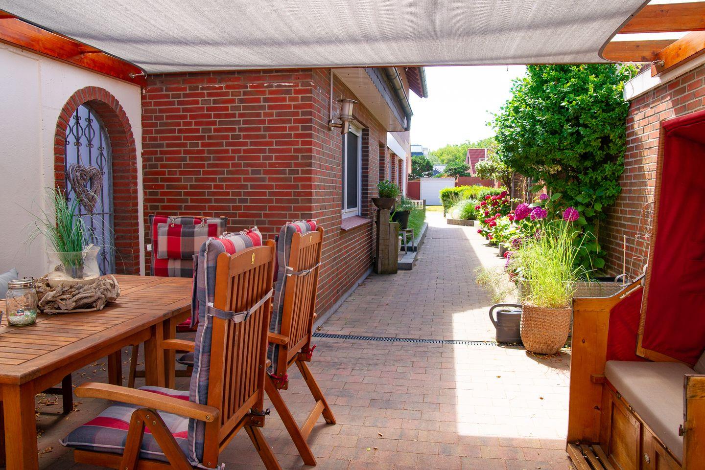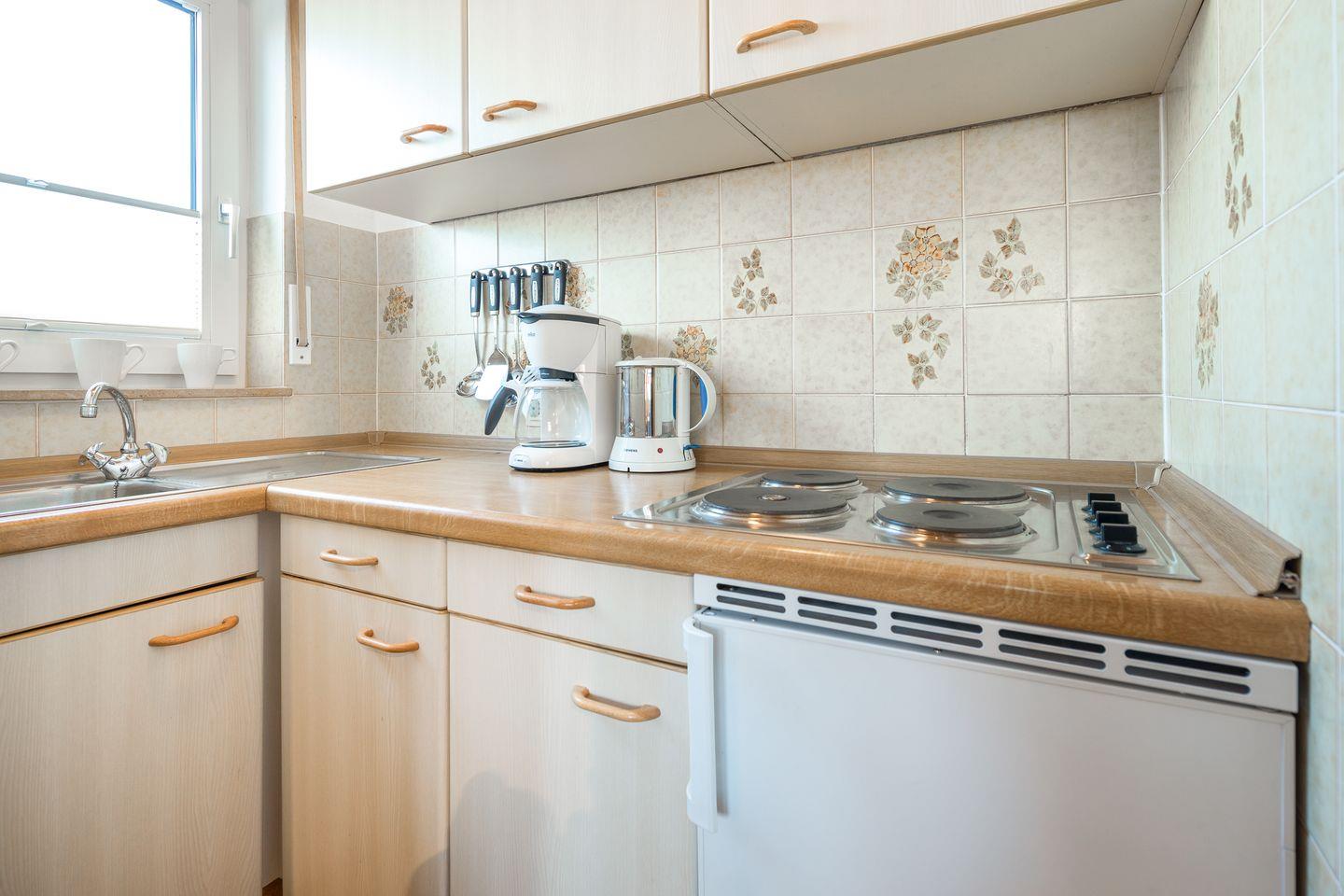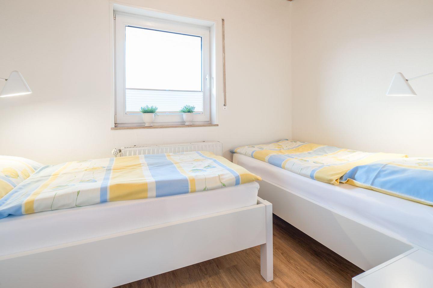 das Appartement im 1. OG verfügt über ein separates Schlafzimmer mit zwei über Eck stehenden Einzelbetten. Im Wohn-Schlafraum mit Essecke ist eine weitere Schlafmöglichkeit auf dem Schlafsofa (1,40m breit). Dahinter liegt die Küchenzeile in einem separaten Raum. Badezimmer mit Dusche/WC. Im Haus befinden sich fünf weitere Ferienwohnungen. Bäcker, Lebensmittelgeschäft und Fahrradverleih sind die Nordhelmstraße runter fußläufig schnell zu erreichen.