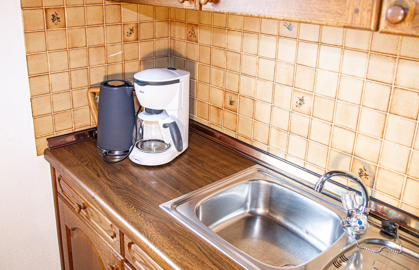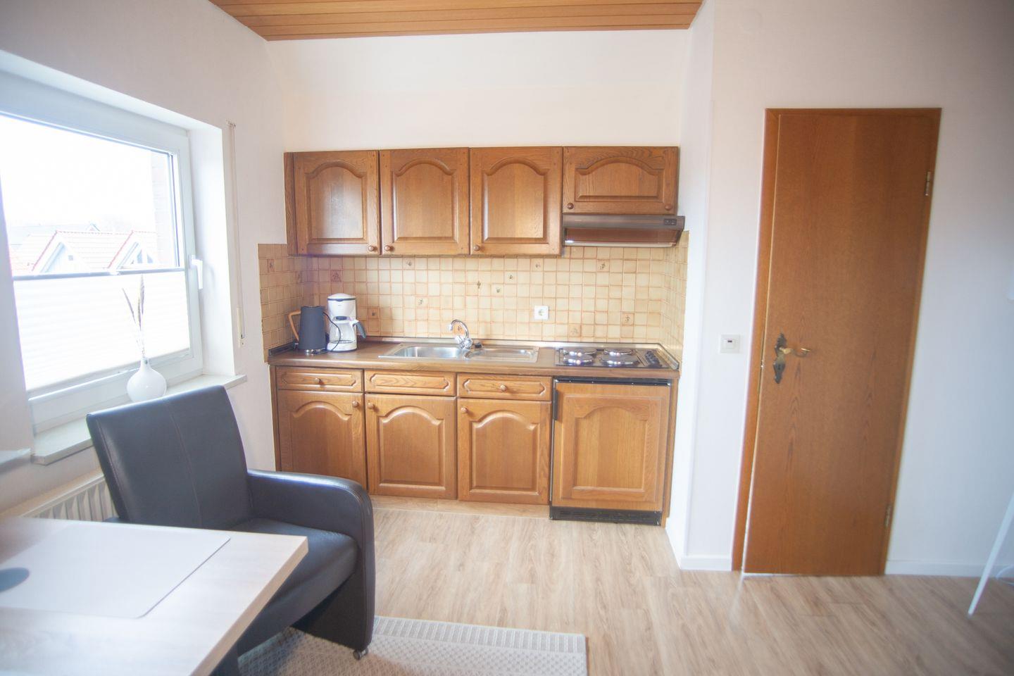 der zweckmäßig ausgestattete Wohn-Schlafraum verfügt über ein Doppelschrankbett (1,60m Breite), kleine Küchenzeile und Essecke für zwei Personen. Das Tageslichtbad hat Dusche und WC. Im Haus Ahorn befinden sich fünf weitere Ferienwohnungen. Bäcker, Lebensmittelgeschäft und Fahrradverleih sind die Nordhelmstraße runter fußläufig schnell zu erreichen. Der "Zuckerpad" in den Dünen ganz nah.