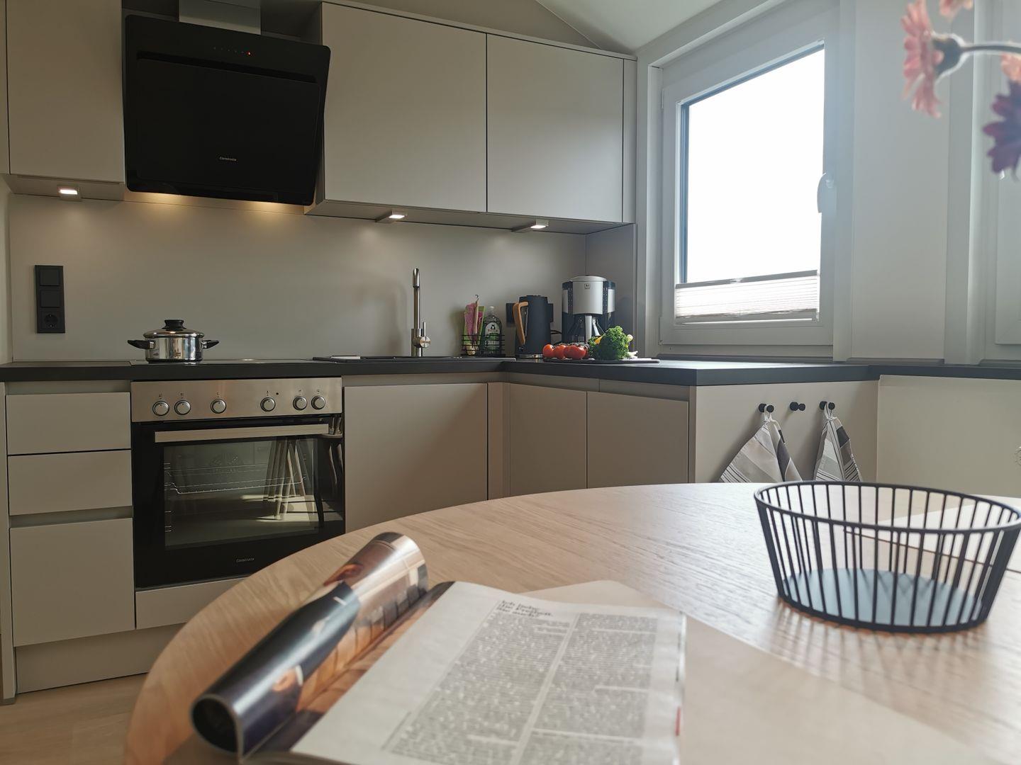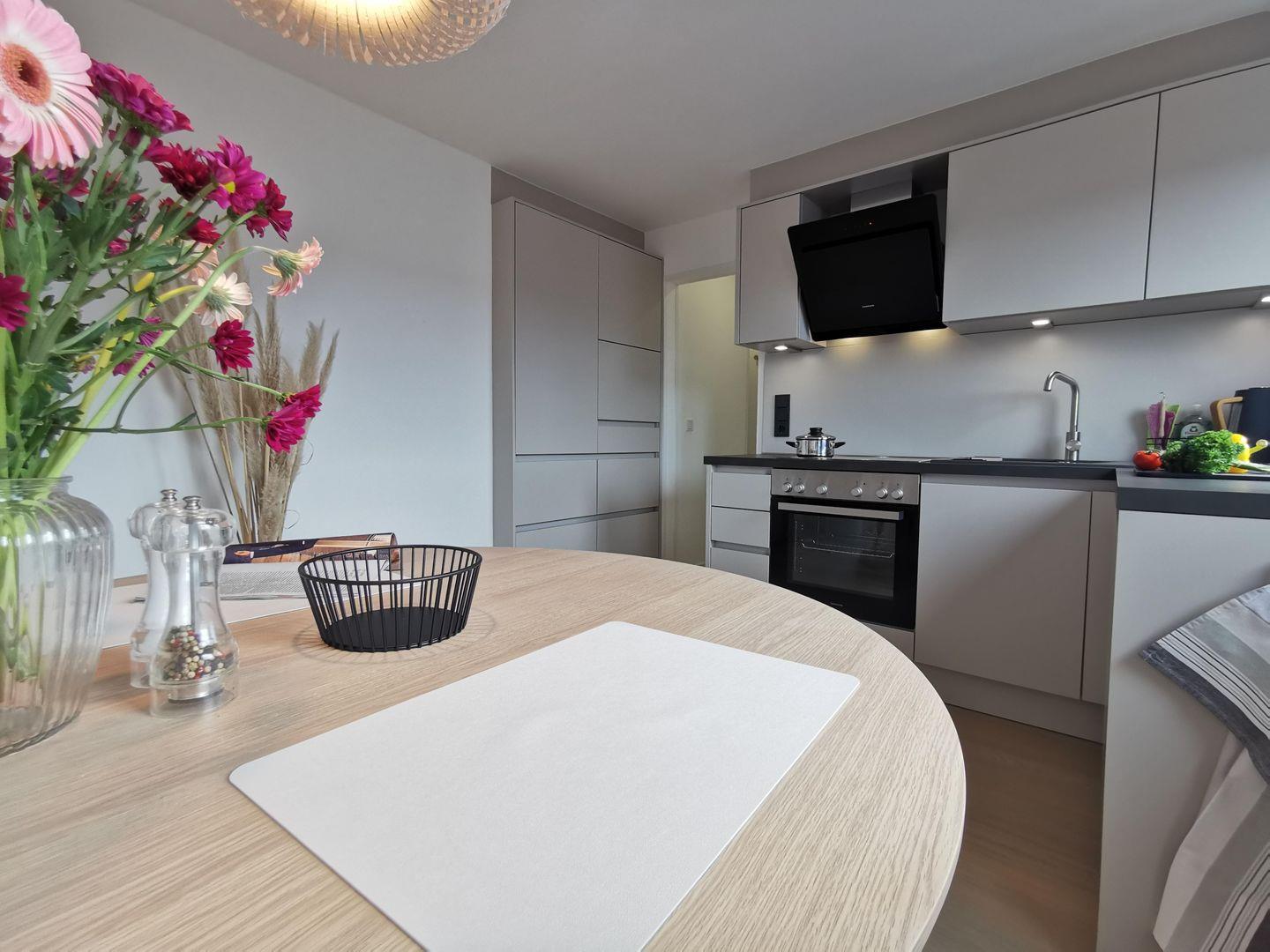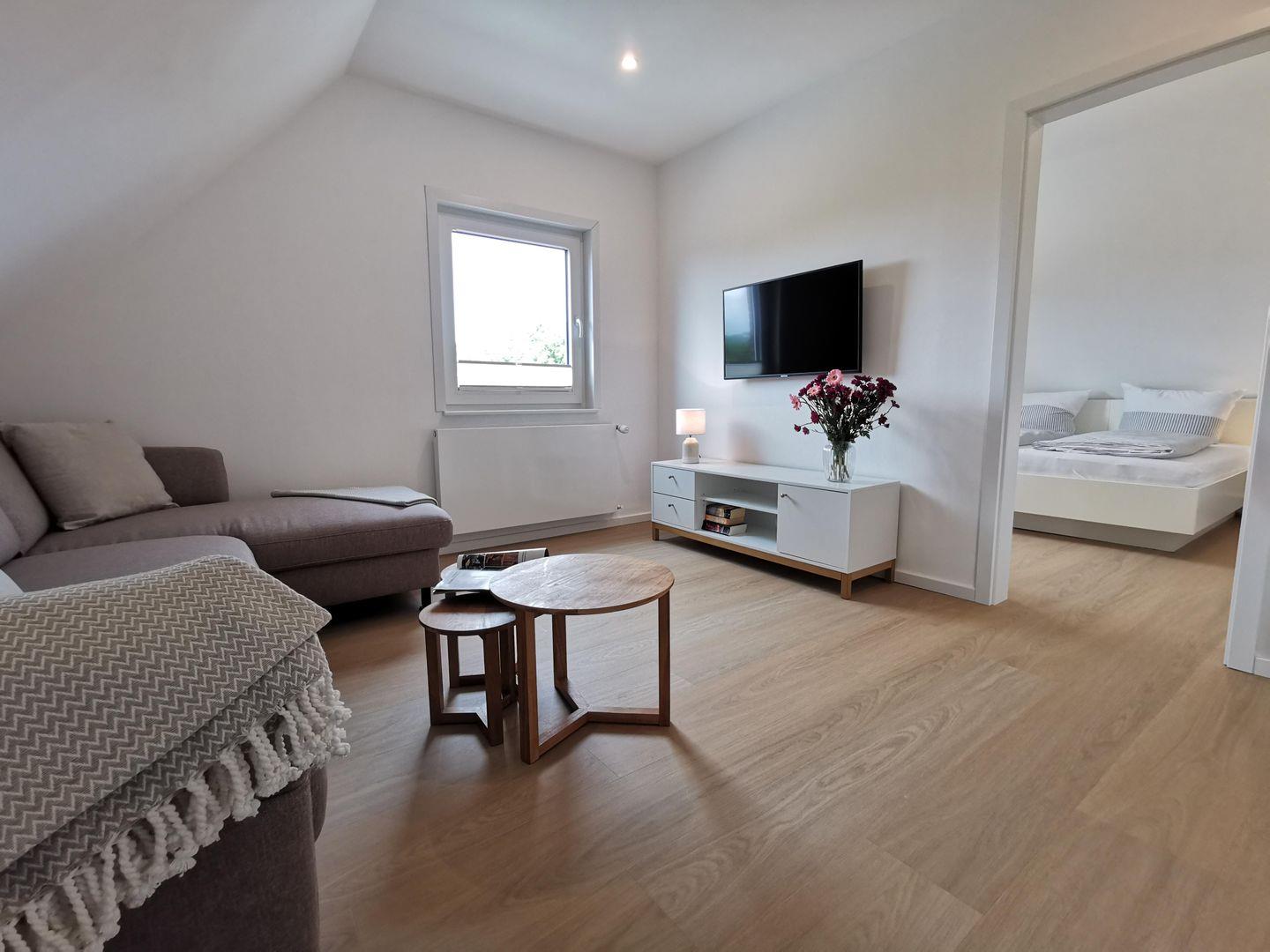das helle und luftige Appartement im 2. OG verfügt über eine komplett ausgestattete Küche mit rundem Esstisch. Hinter dem Wohnzimmer befindet sich das separate Schlafzimmer mit Doppelbett und extra TV. Tageslichtbad mit Dusche/WC.