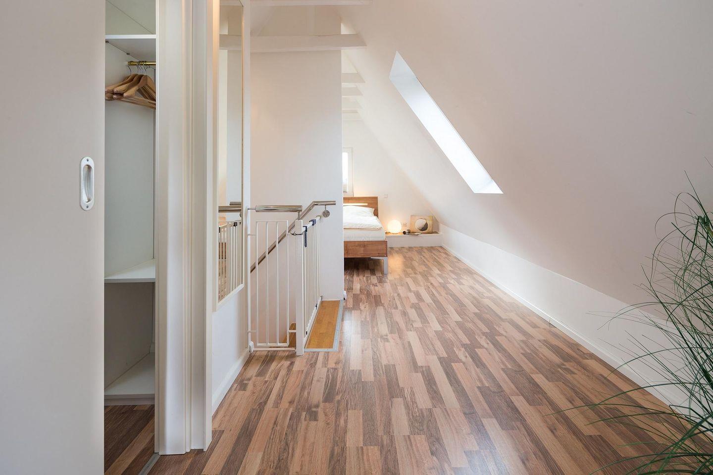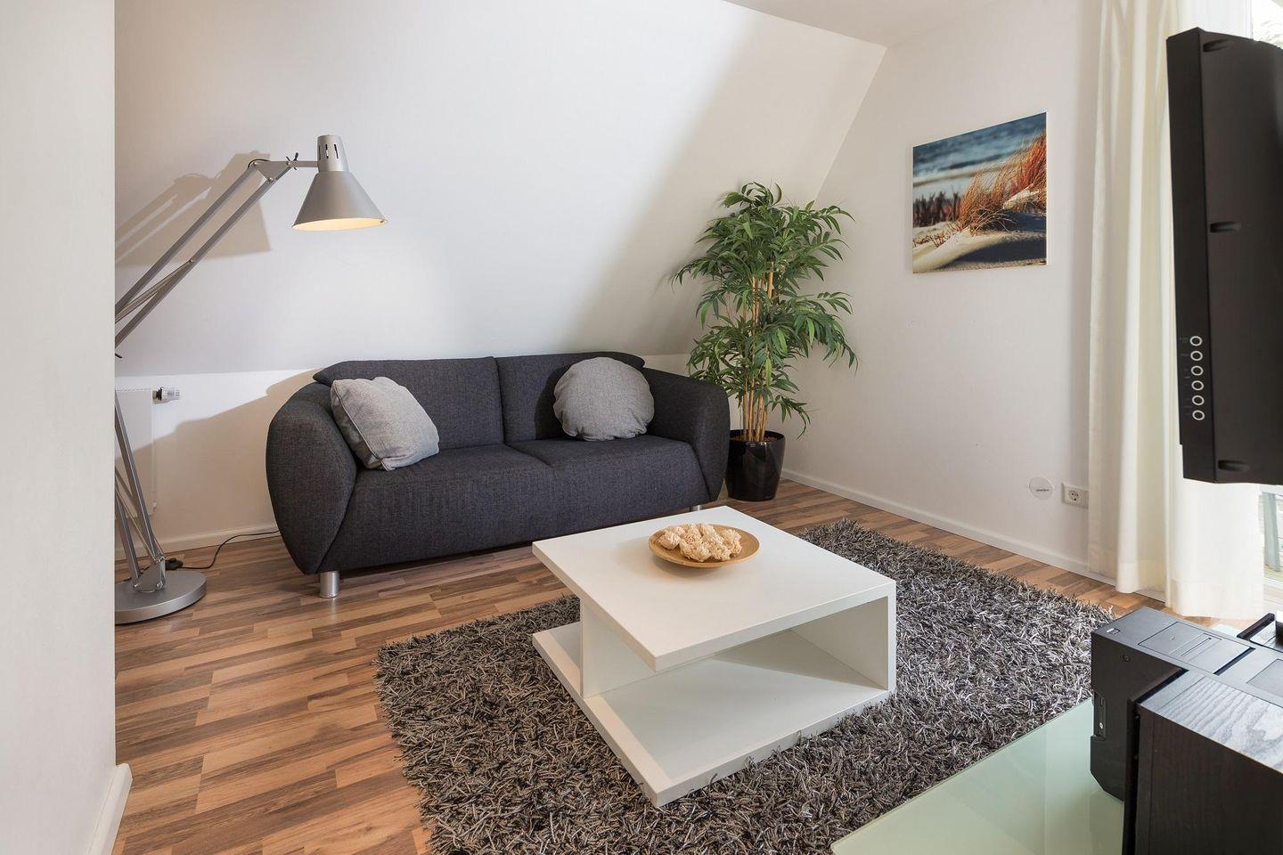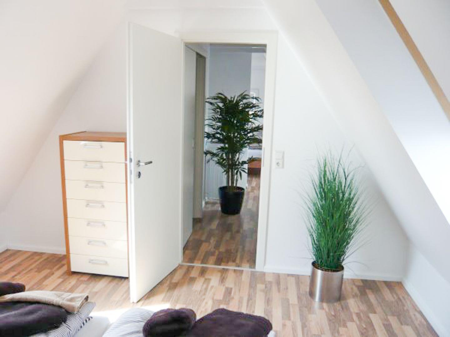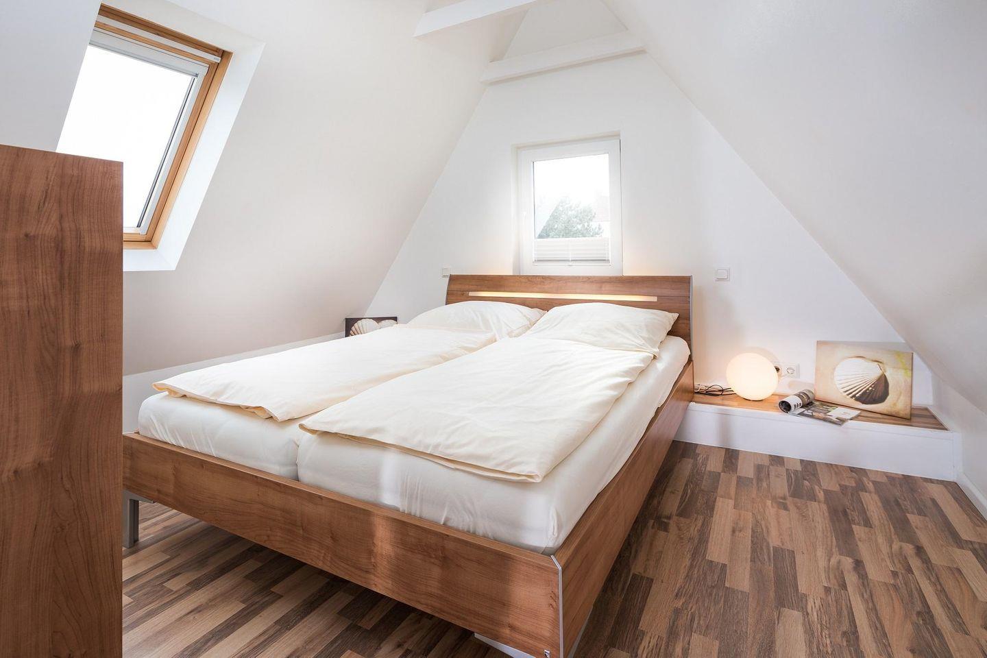in der 1. Etage befinden sich das helle Wohnzimmer mit Küchenzeile und Essecke vor den Balkonfenstern sowie das Tageslichtbad mit Dusche/WC. Im ausgebauten Dachgiebel liegen beide Schlafzimmer mit je einem Doppelbett. Ein begehbarer Kleiderschrank für beide Schlafzimmer steht Ihnen ebenfalls auf der offenen Empore zur Verfügung.