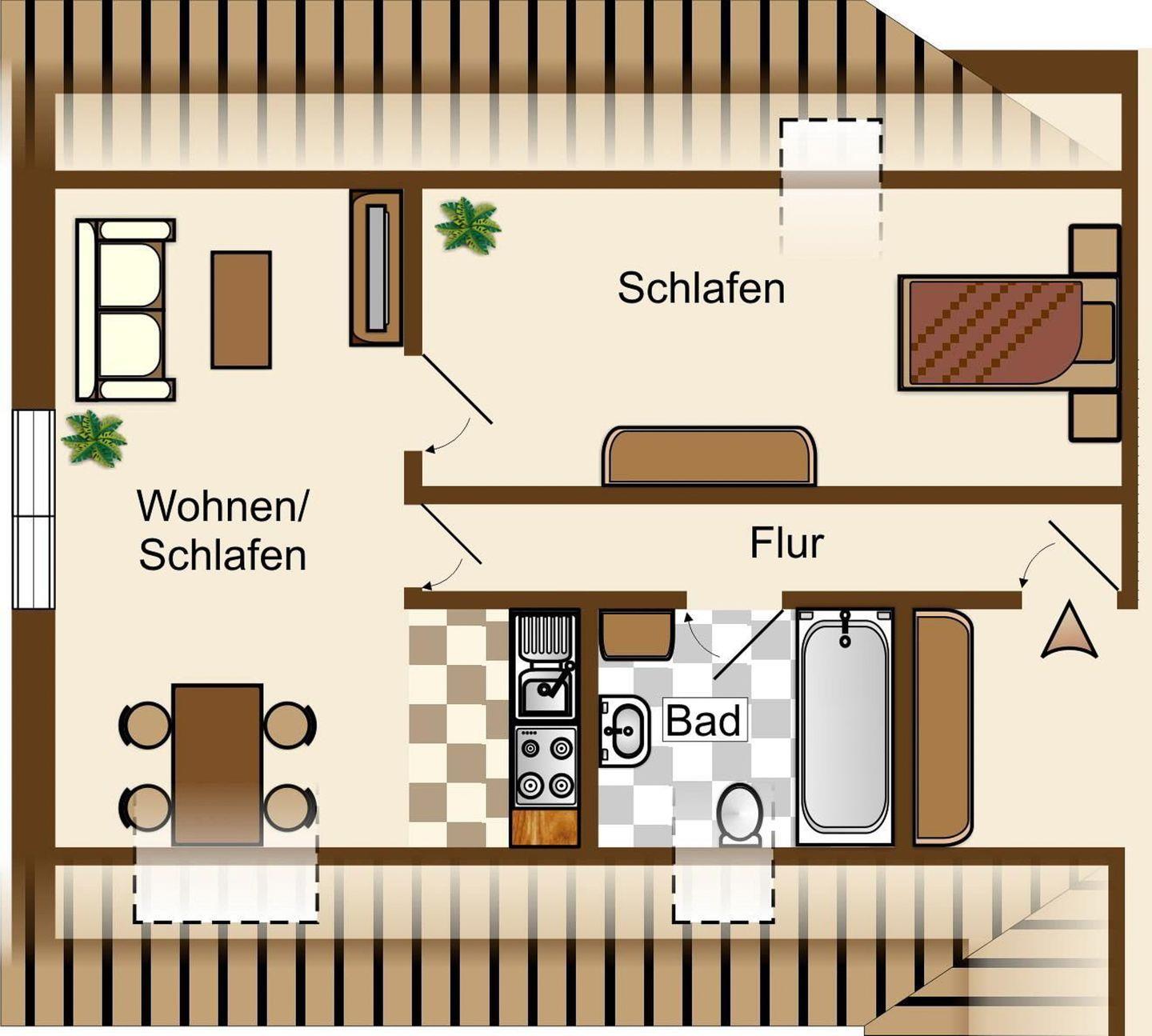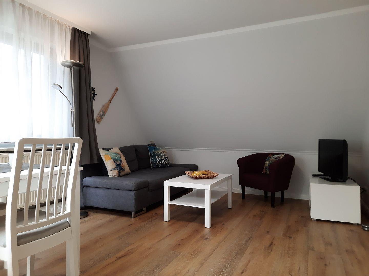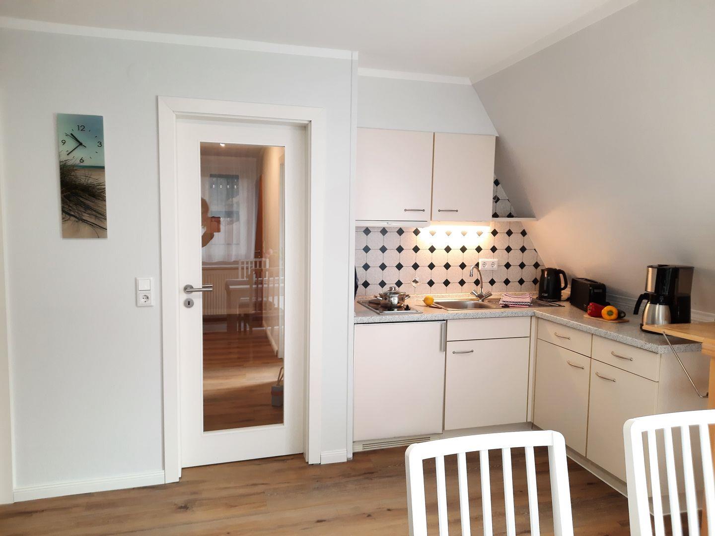 das separate Schlafzimmer mit Doppelbett (1,80 x 2,00m) bietet problemlos Platz für ein eventuell benötigtes Kinderreisebett. Der Wohn-Schlafraum verfügt über ein Schlafsofa, kleine Küchenzeile mit 2-Plattenherd und Essecke. Tageslichtbad mit Dusche/WC. Im Haus befinden sich 2 weitere Ferienwohnungen. Lebensmittelgeschäft und Bäcker sind um zwei Ecken schnell fußläufig zu erreichen.