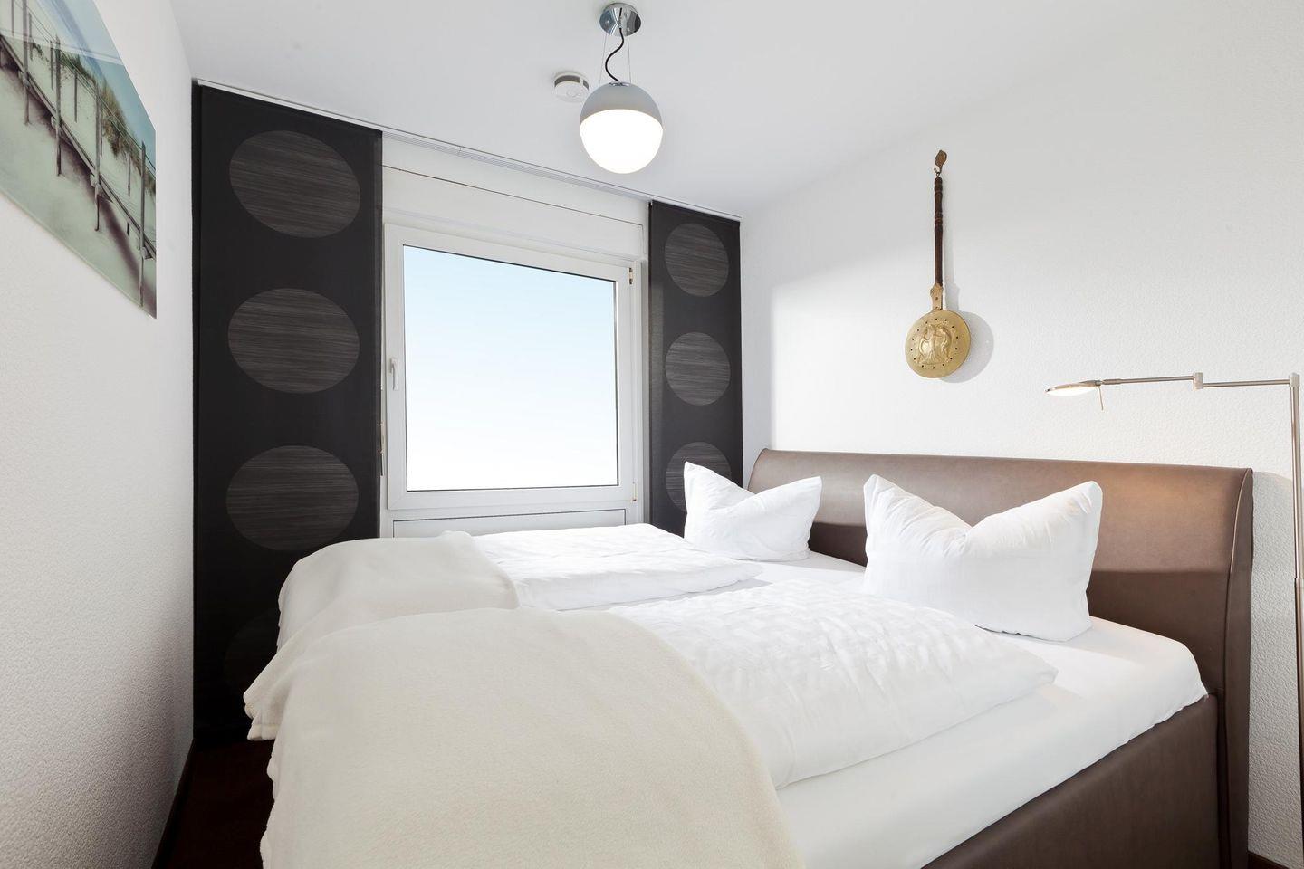 Das Appartement verfügt über ein separates Schlafzimmer mit Doppelbett und einen Wohn-Schlafraum mit Schlafsofa und Essecke am Fenster. Die voll ausgestattete Küchenzeile ist separat. Badezimmer mit Dusche/WC. Der Zugang zum kleinen Südbalkon mit Blick über die Dächer ist vom Wohnzimmer aus. Kein Wlan. Fahrstuhl vorhanden. Bäcker, Lebensmittelgeschäfte und die Strandpromenade sind die Straße runter fußläufig zu erreichen.