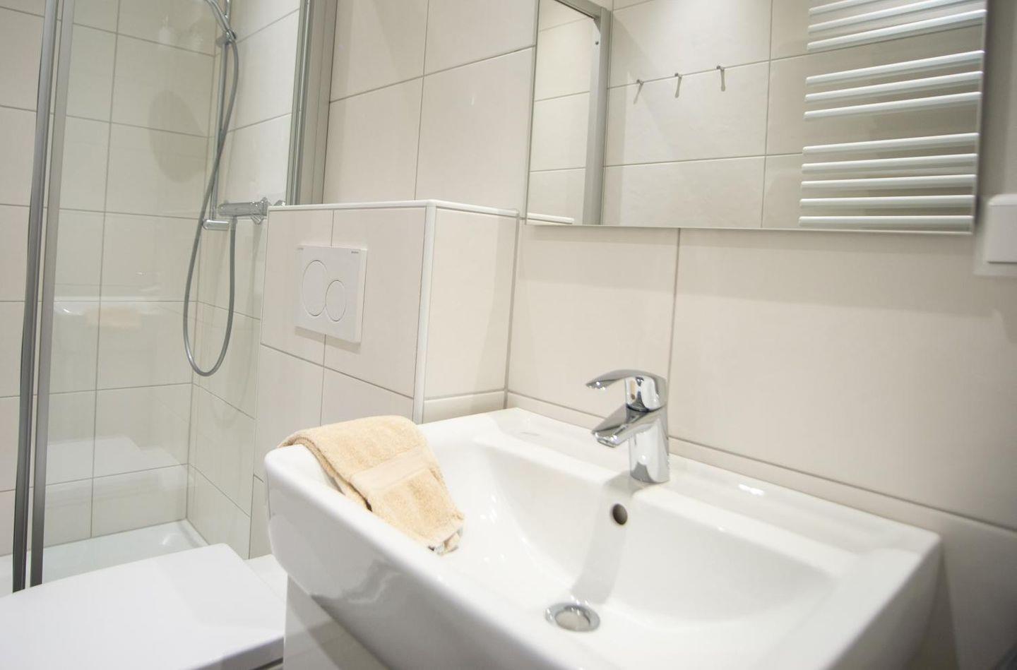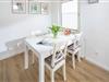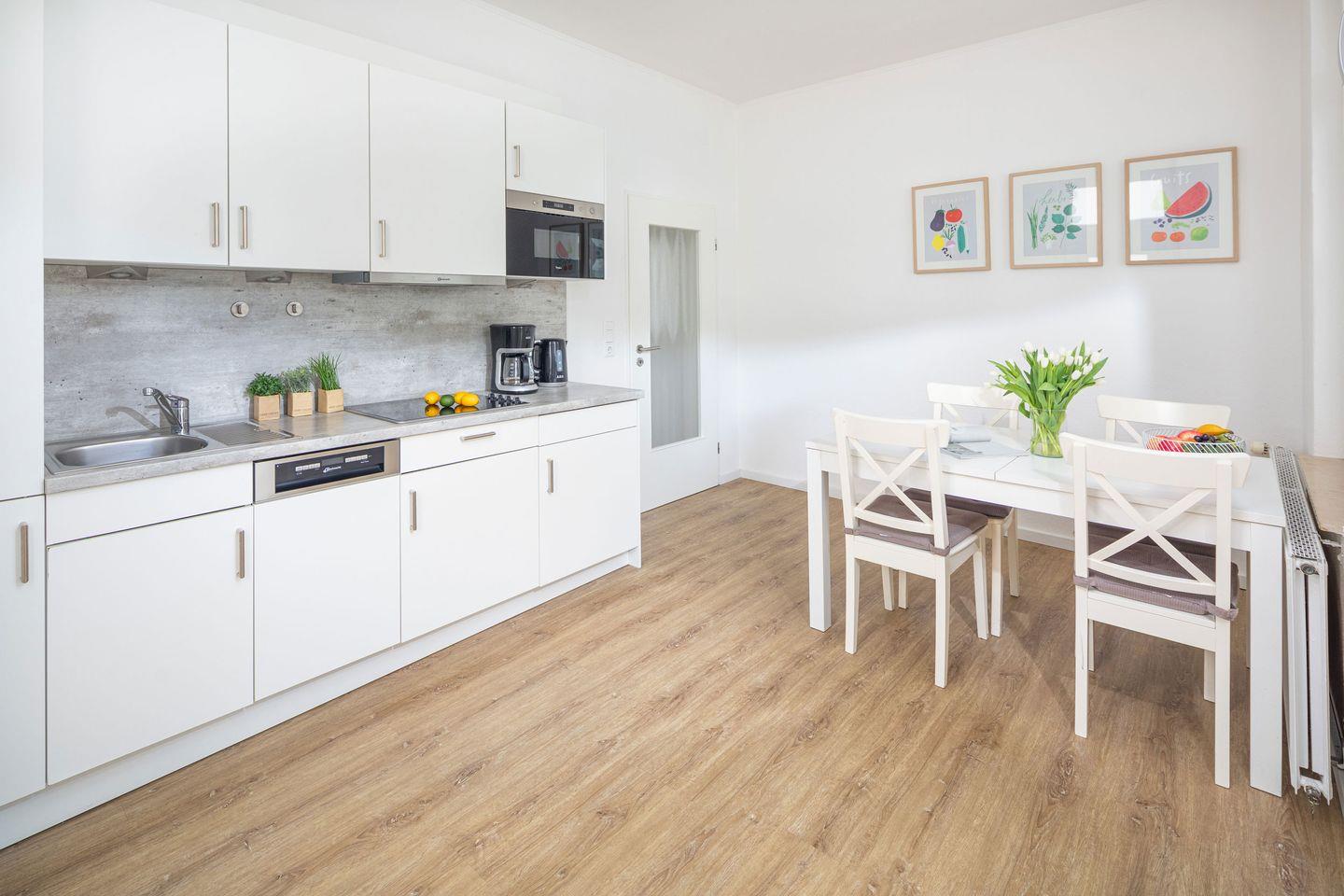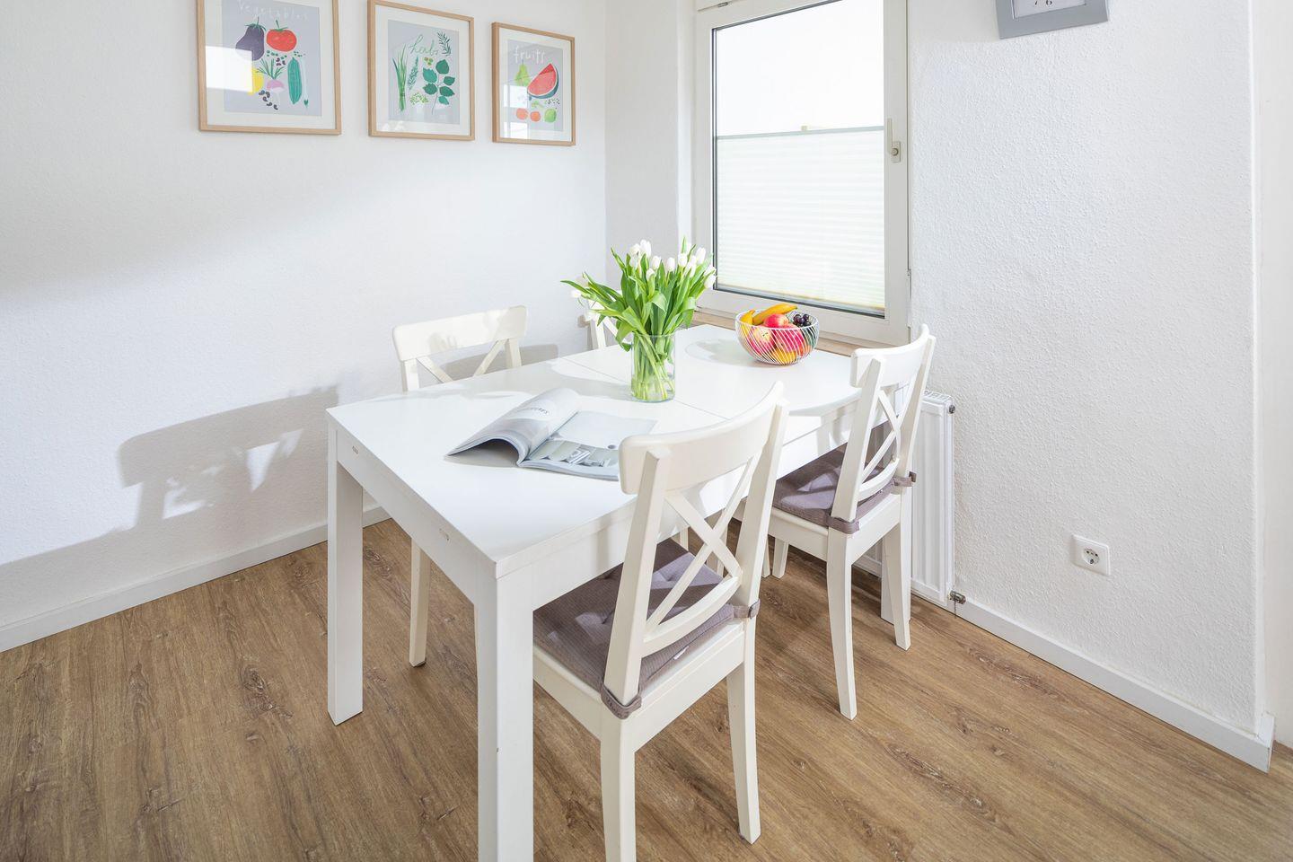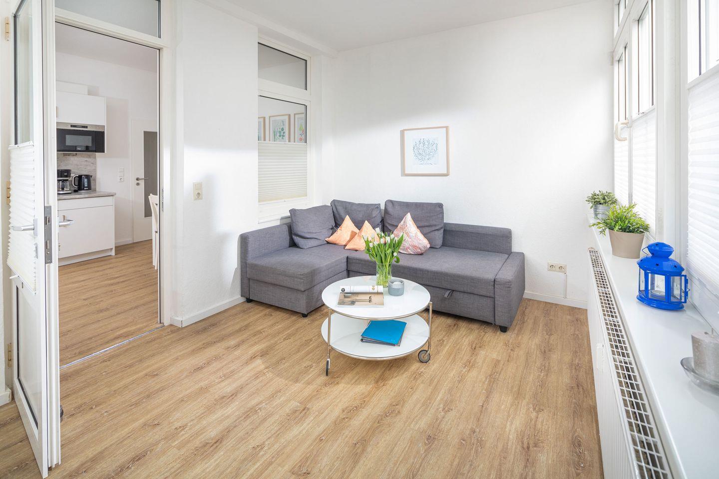 die separate, voll ausgestattete Küche mit Essecke im Eingangsbereich bietet Platz für 4 Personen. Rechts davon liegt das Wohnzimmer, links davon Diele, Badezimmer mit Dusche/WC sowie ein Schlafzimmer mit Doppelbett (180x200). Hinter diesem Schlafzimmer befindet sich das kleine 2. Schlafzimmer mit Etagenbett und Sitzgelegenheit.