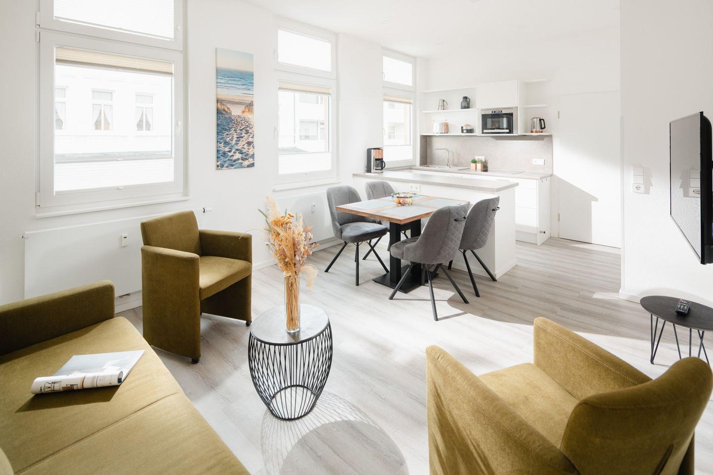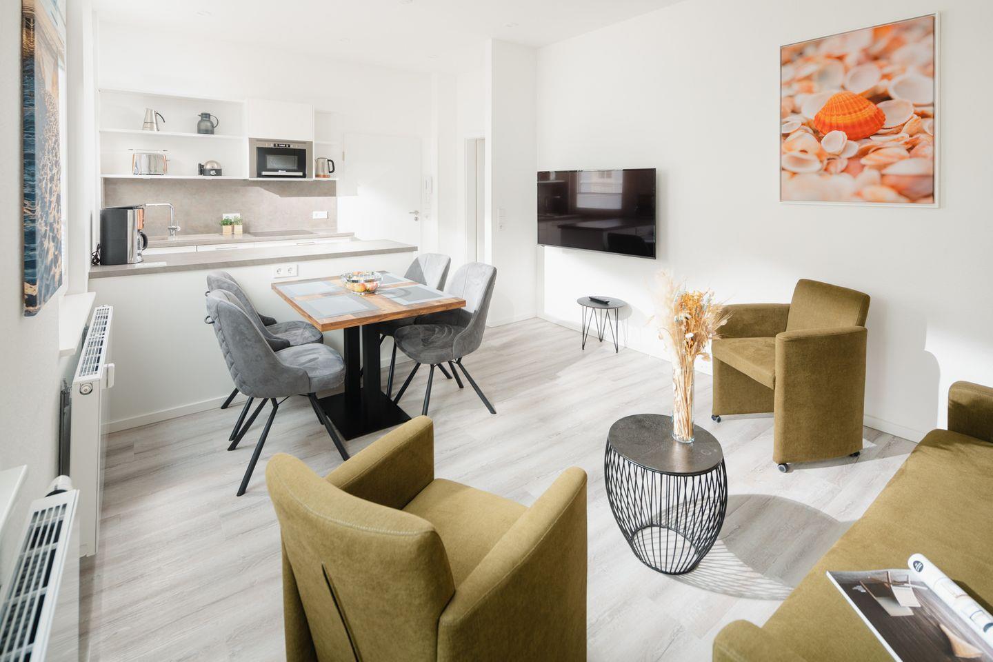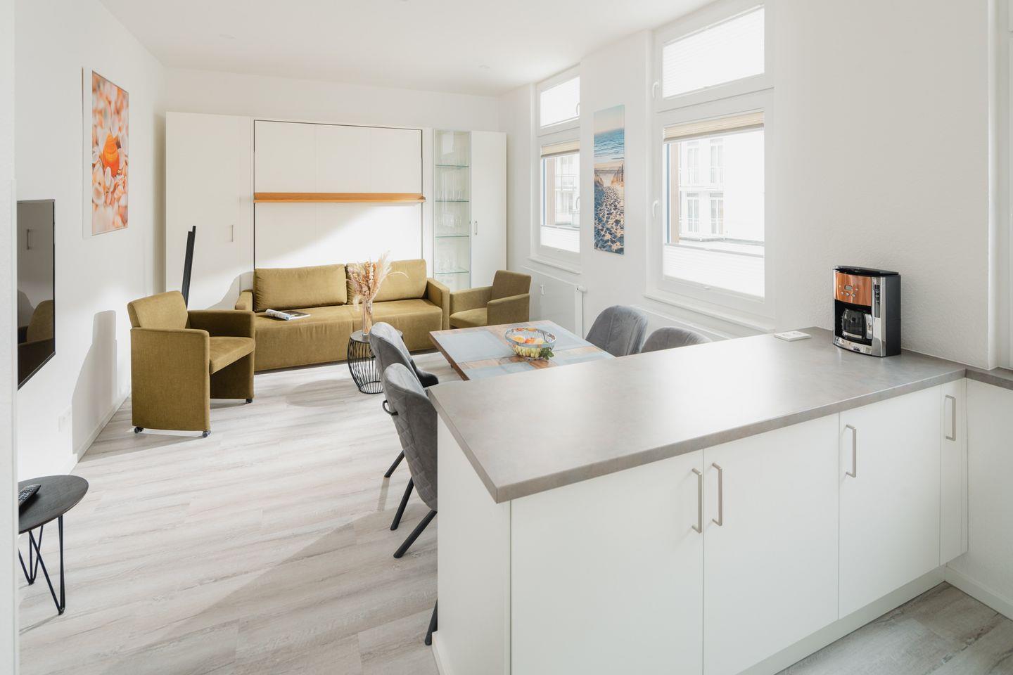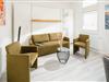 großzügiger Wohn-Schlafraum mit hochwertigem Verwandlungs-Doppelbett in Komforthöhe. Abends lässt sich dies leicht mit einem Griff über das Sofa klappen und schafft so tagsüber Platz für eine Sofaecke. Das separate Schlafzimmer mit Doppelbett und zusätzlichem TV sowie Schreibtisch mit Monitor bietet problemlos Platz für ein eventuell benötigtes Kinderreisebettchen. Diele, offene und voll ausgestattete Küchenzeile mit Essecke. Tageslichtbad mit Dusche/WC.