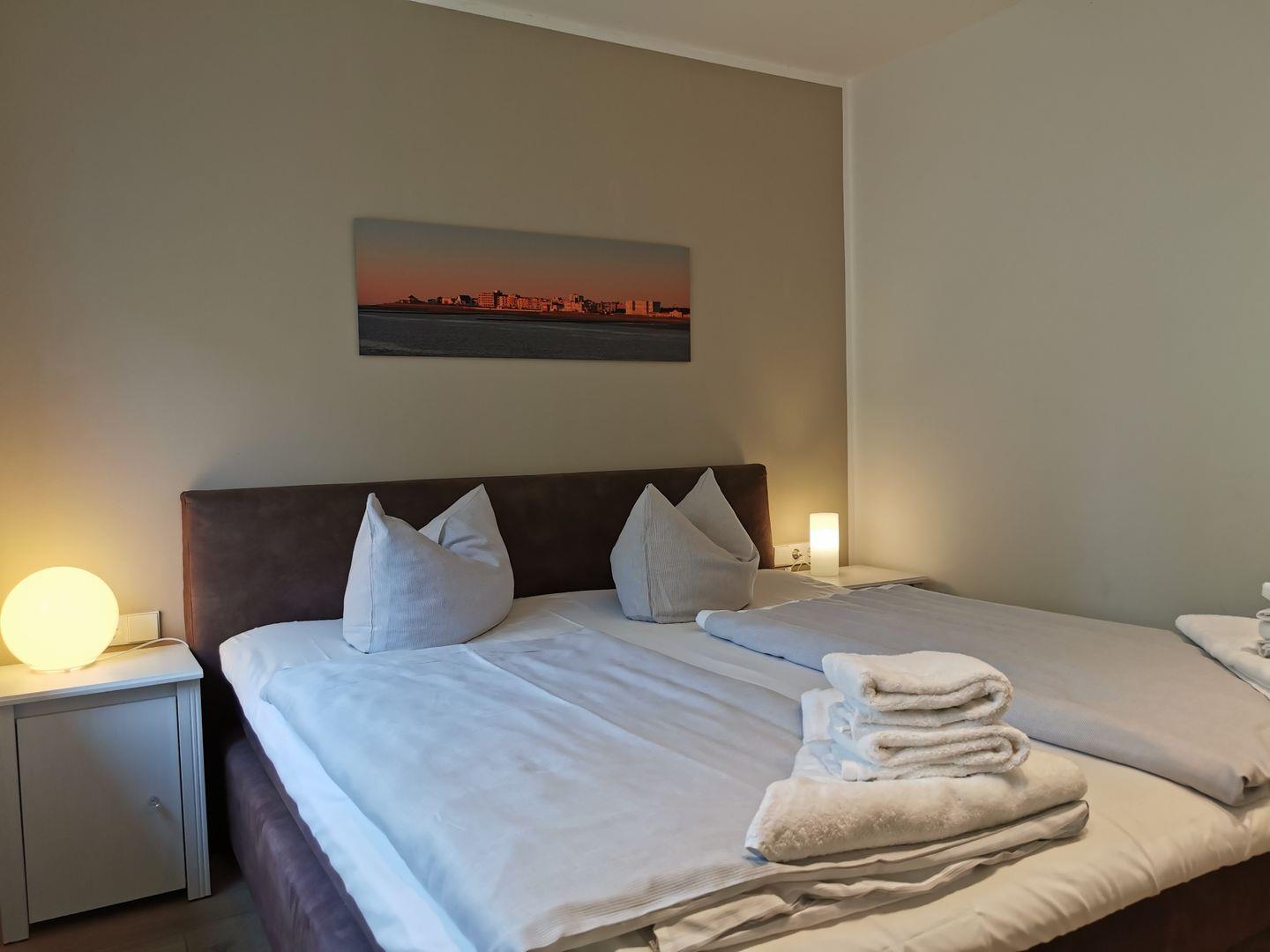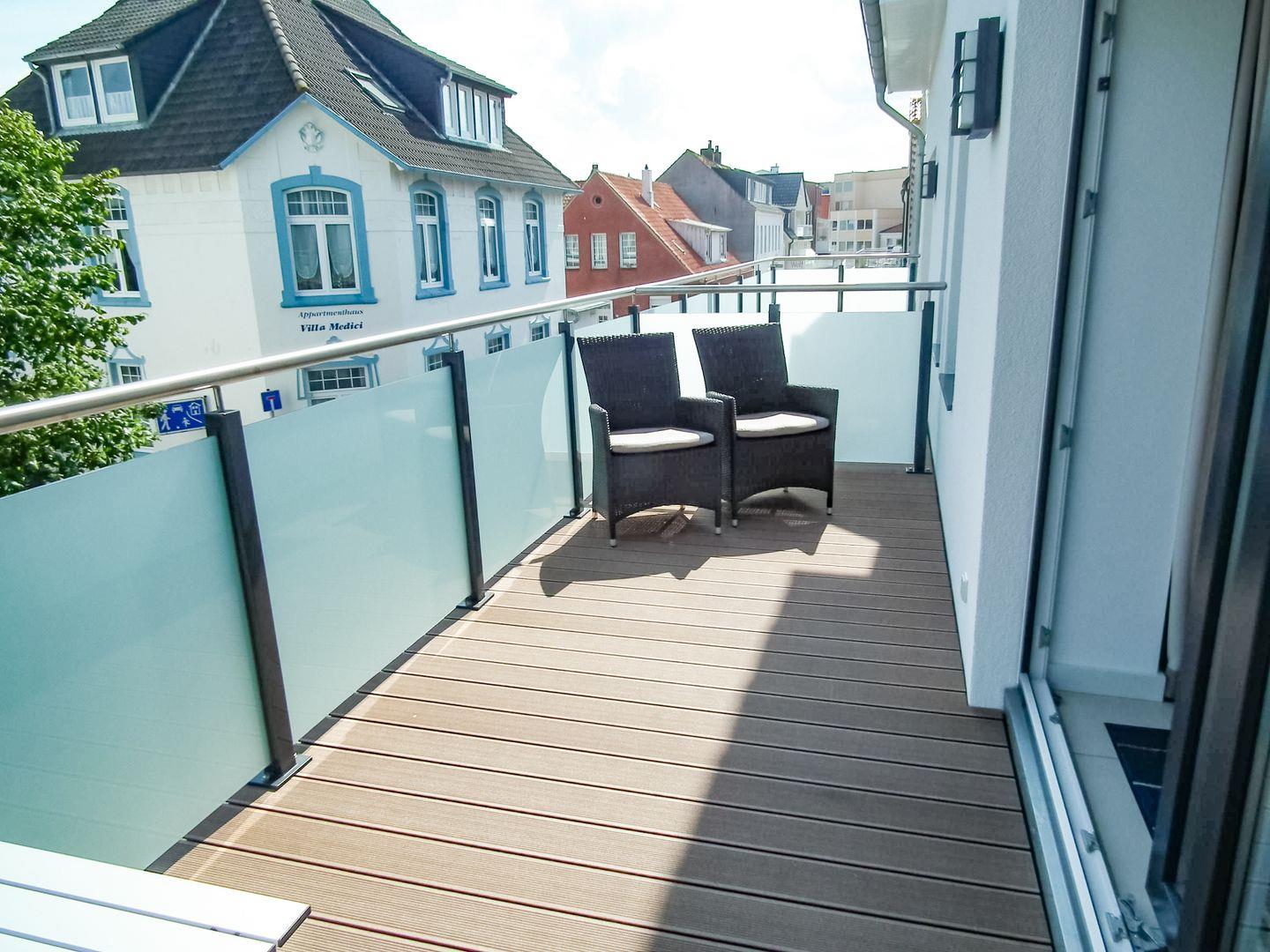 die Ferienwohnung im 1. OG verfügt über ein separates Schlafzimmer mit TV, Wohn-Schlafraum (Schlafsofa 1,60m) mit Essecke und Küchenzeile. Hinter dem Schlafzimmer liegt das Tageslichtbad mit Dusche/WC, im Eingangsbereich ein zusätzliches Gäste-WC. Vom Wohnraum aus haben Sie Zugang zum Balkon. Bäcker, Lebensmittelgeschäfte und die Strandpromenade sind um die Ecke auf der Strandstraße fußläufig leicht zu erreichen.