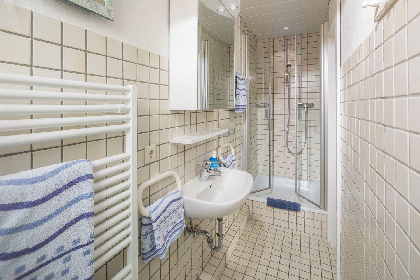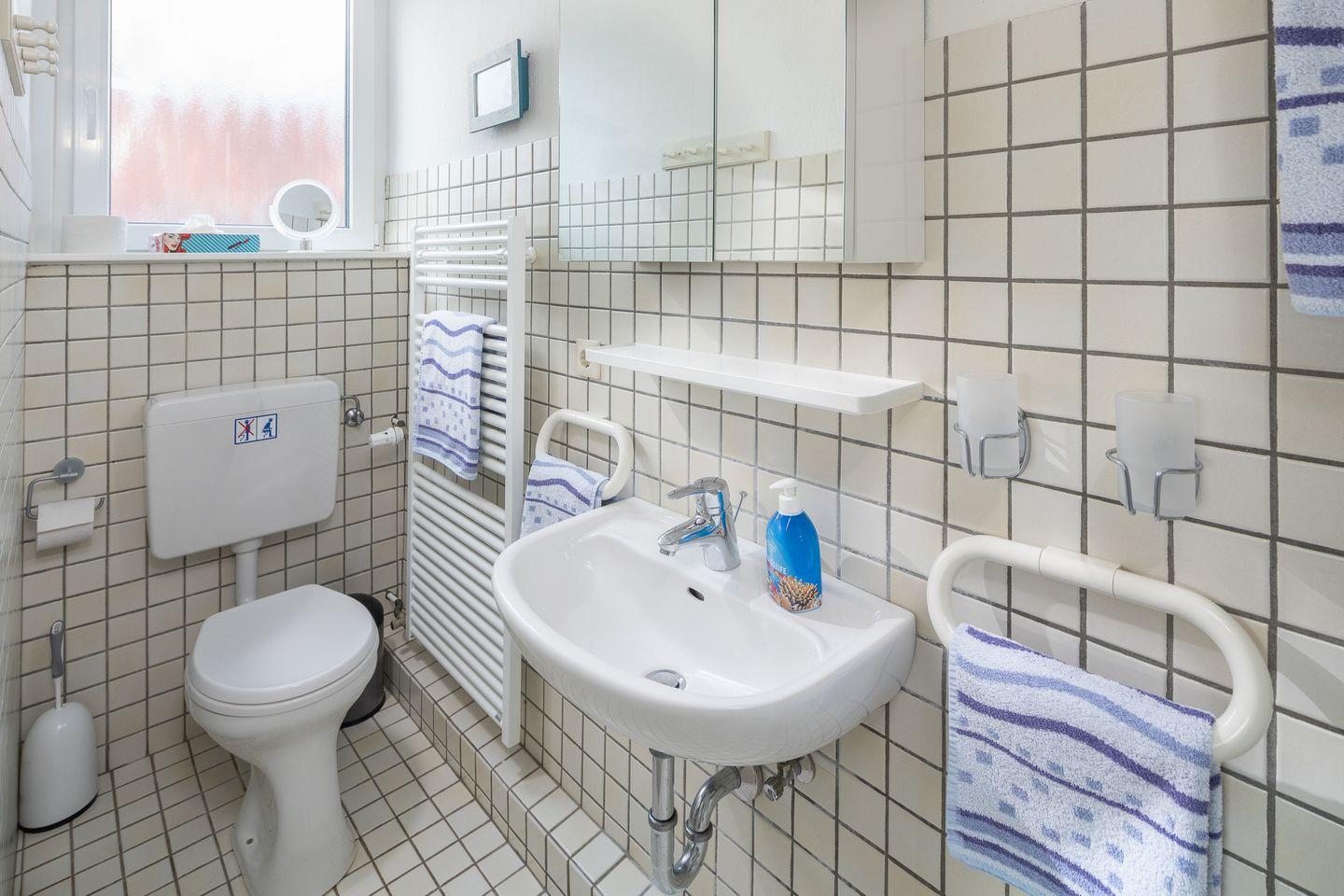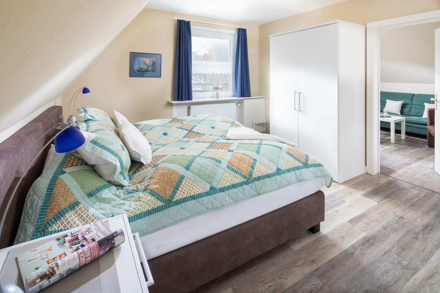 die Ferienwohnung im 1. OG verfügt über ein separates Schlafzimmer mit Doppelbett, Wohnraum mit vollausgestatteter Küchenzeile und Essecke sowie über ein Tageslichtbad mit Dusche/WC. Der wohnungseigene Parkplatz ist in Hausnähe im Kiefernweg. Im Haus befinden sich 2 Ferienwohnungen, Lebensmittelgeschäfte mit Bäcker in 350m Entfernung.