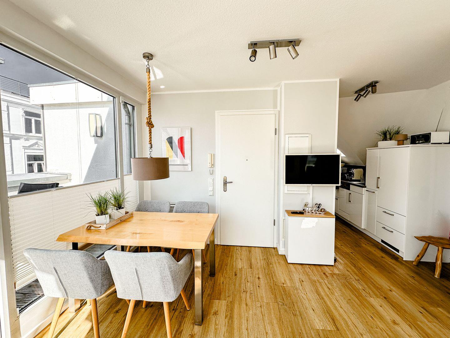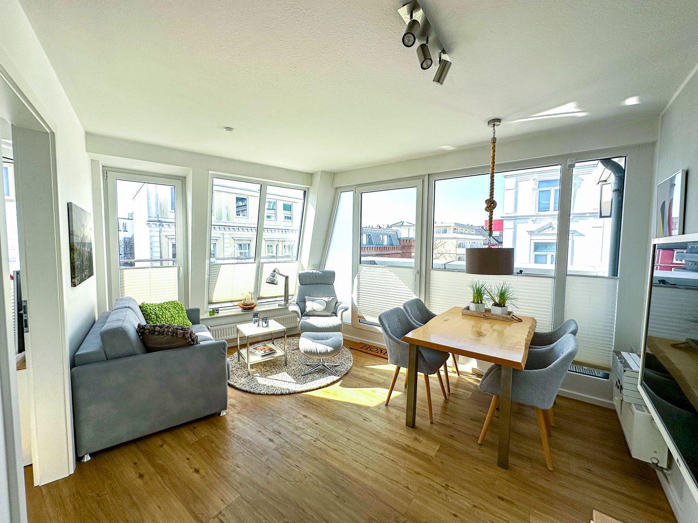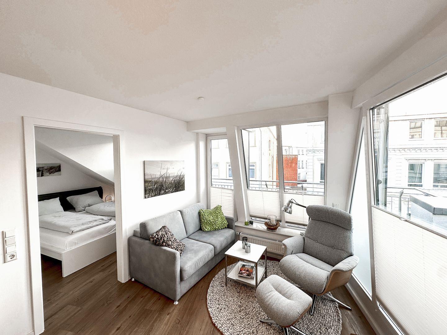 das Wohnzimmer mit Sofa und Essecke wird umrandet von einem Balkon, von dem aus Sie das Meer "die Heinrichstraße rauf" sehen können. Die vollausgestattete Küchenzeile befindet sich in einer Nische. Tageslichtbad mit Dusche/WC. Das separate Schlafzimmer mit Doppelbett verfügt über ein zusätzliches TV-Gerät. In der Seebox befinden sich 5 weitere Ferienwohnungen.